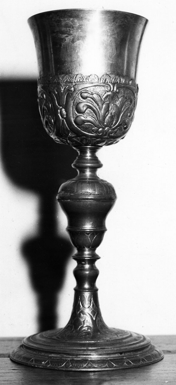 Base tonda modanata con cornice a foglie e decorazione fitomorfa all'interno. Nodo piriforme modanato, con giro inferiore a foglie e baccellature in alto. Sottocoppa a cartelle ellittiche includenti cespi di foglie, orlo superiore a palmette