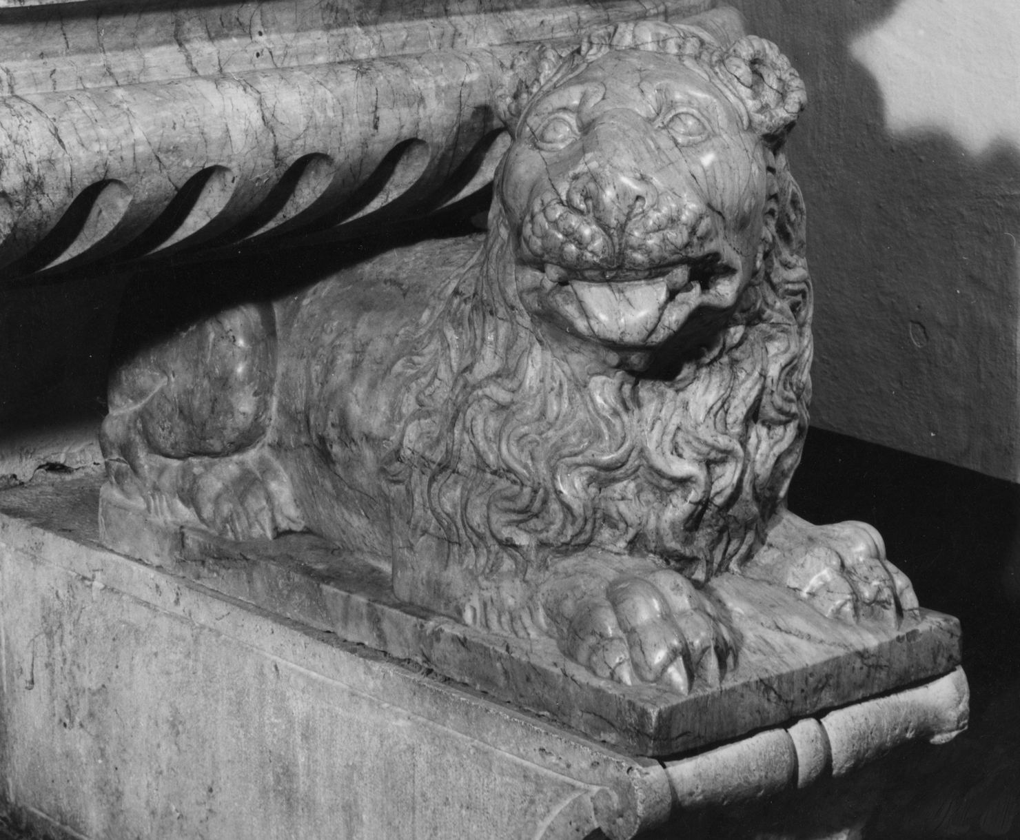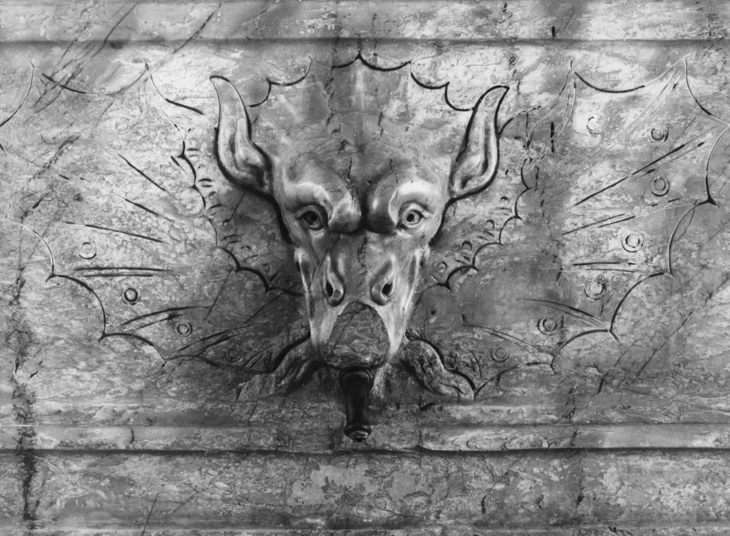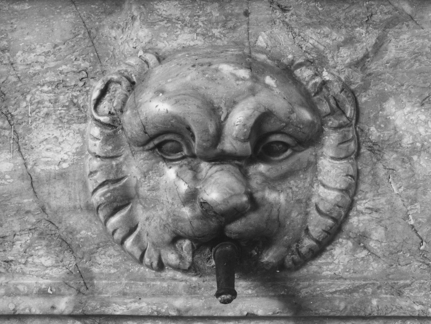 lavabo a vasca rettangolare scolpito in marmo. La vasca è sostenuta da leoni stilofori accovacciati con teste rivolte verso il centro e bocche aperte appoggiati su mensole modanate a ricciolo con embricatura nella nervatura centrale; vasca rettangolare con angoli smussati a corpo curvilineo decorato da baccellatura con orlo strozzato e modanato e ampio labbro a becco di civetta baccellato; dossale con sette pispinelli decorati da mascheroni, sei con testa di leone intervallati al centro da testa di drago a rilievo con ali e scaglie incise a solchi; (segue in DESS)
