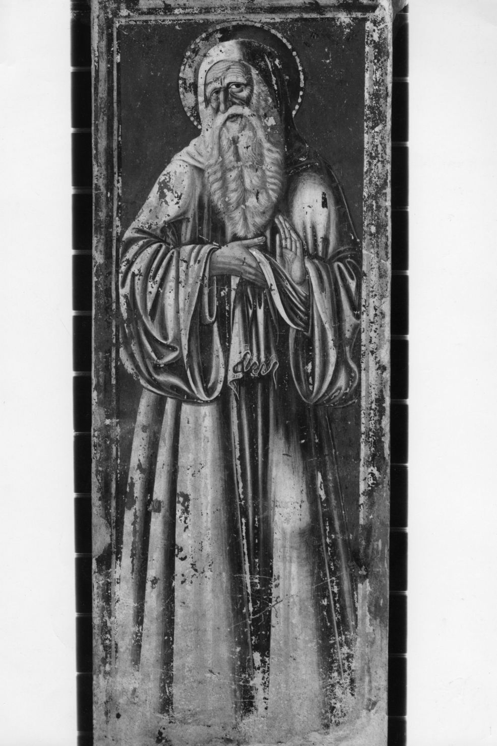 dipinto policromo sul fronte di un pilastro, formato rettangolare in verticale con cornice modanata dipinta che inquadra la figura. santo benedettino barbuto con cappuccio indossato raffigurato di fronte in piedi nell'atto di sfilarsi dall'interno di una manica un panno bianco