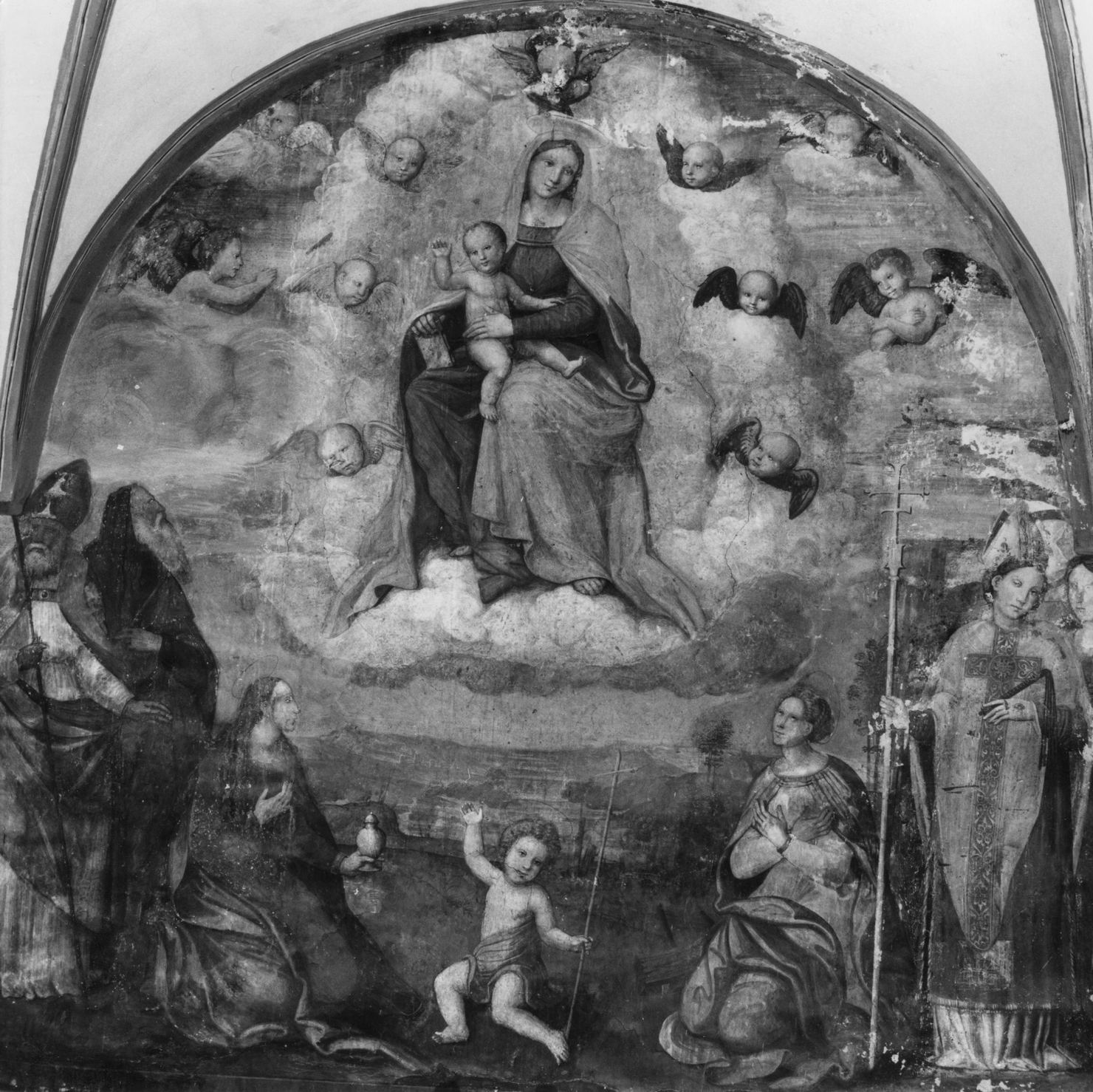 affresco policromo inserito sotto gli archi di tre volte che lo inquadrano. Madonna con il Bambino sulle ginocchia in atto di benedire e con in manoun libro di preghiere, circondata da nubi con cherubini e angioletti, inbasso al centro san Giovannino inginocchiato e con la mano protesa, ai lati due gruppi di santi e sante