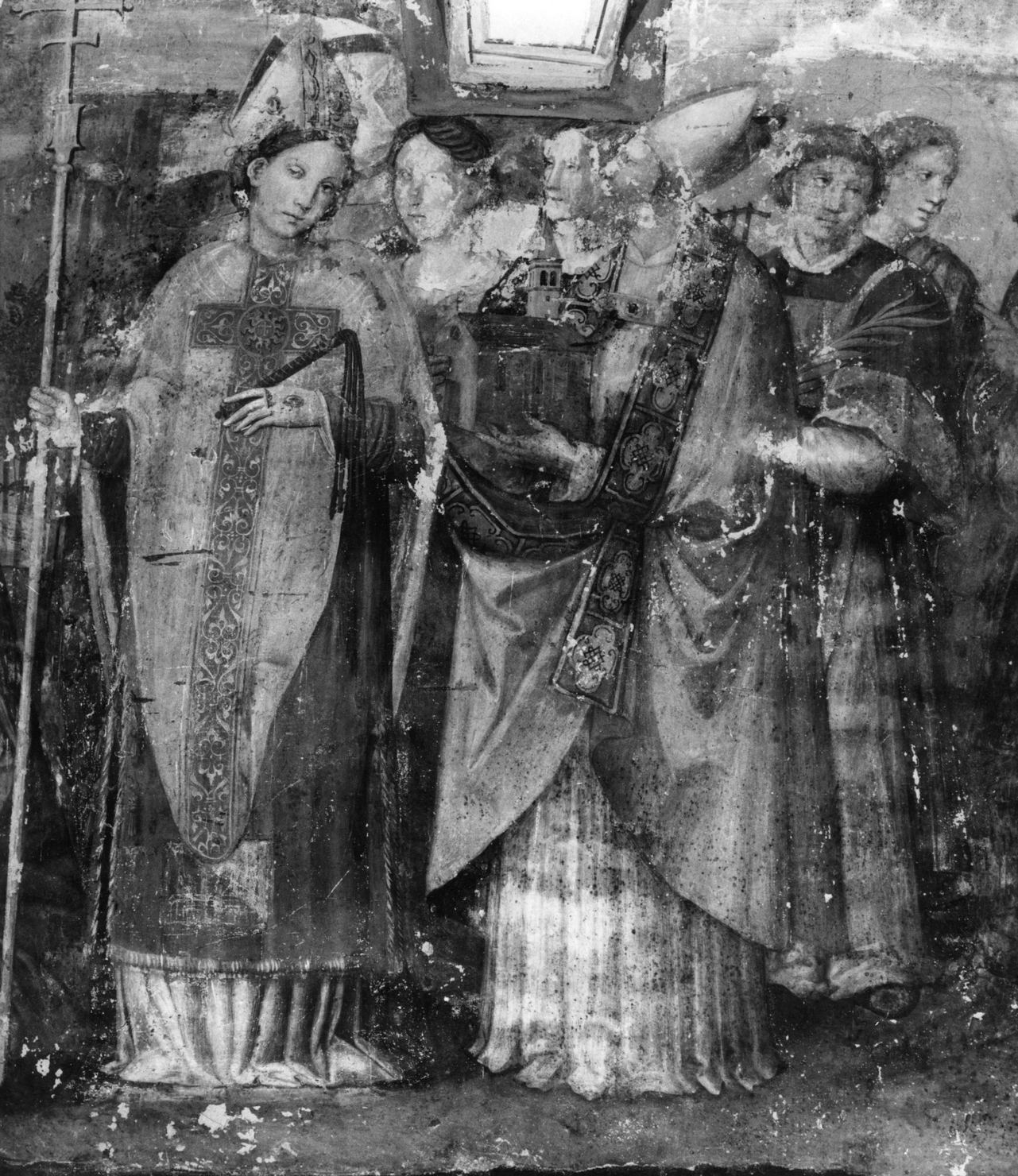 - NOTIZIE STORICO CRITICHE Il dipinto fa parte, assieme ai tondi raffiguranti Scene della vita dellaVergine, affrescati nel soffitto, della decorazione ad affresco della salacapitolare, realizzata da un pittore, per il momento anonimo. Tale artista, operante a cavallo tra XV e XVI secolo mostra forti affinità stilistiche, con alcuni pittori senesi del tempo, come Girolamo del Pacchia o Vincenzo Tamagni