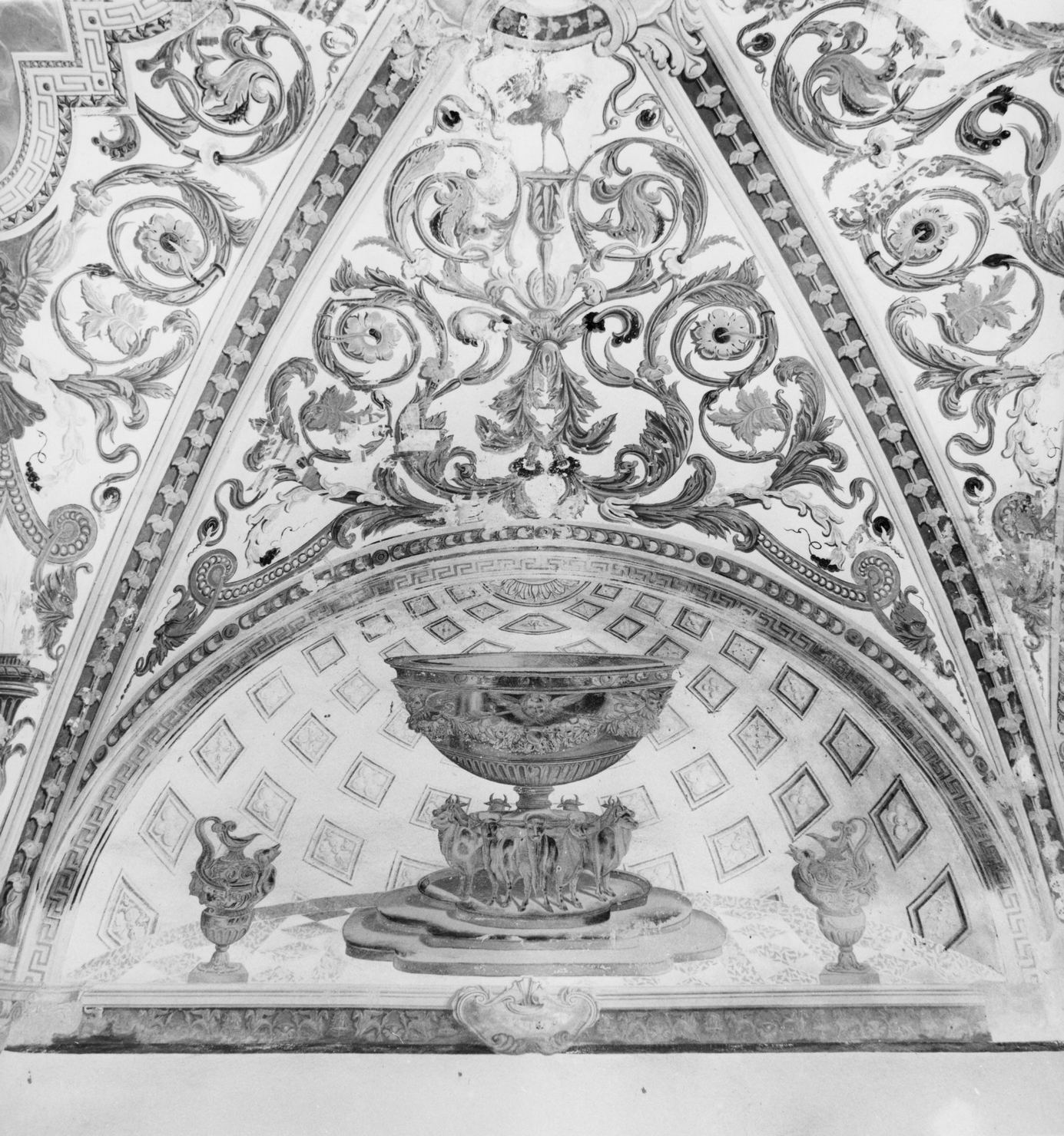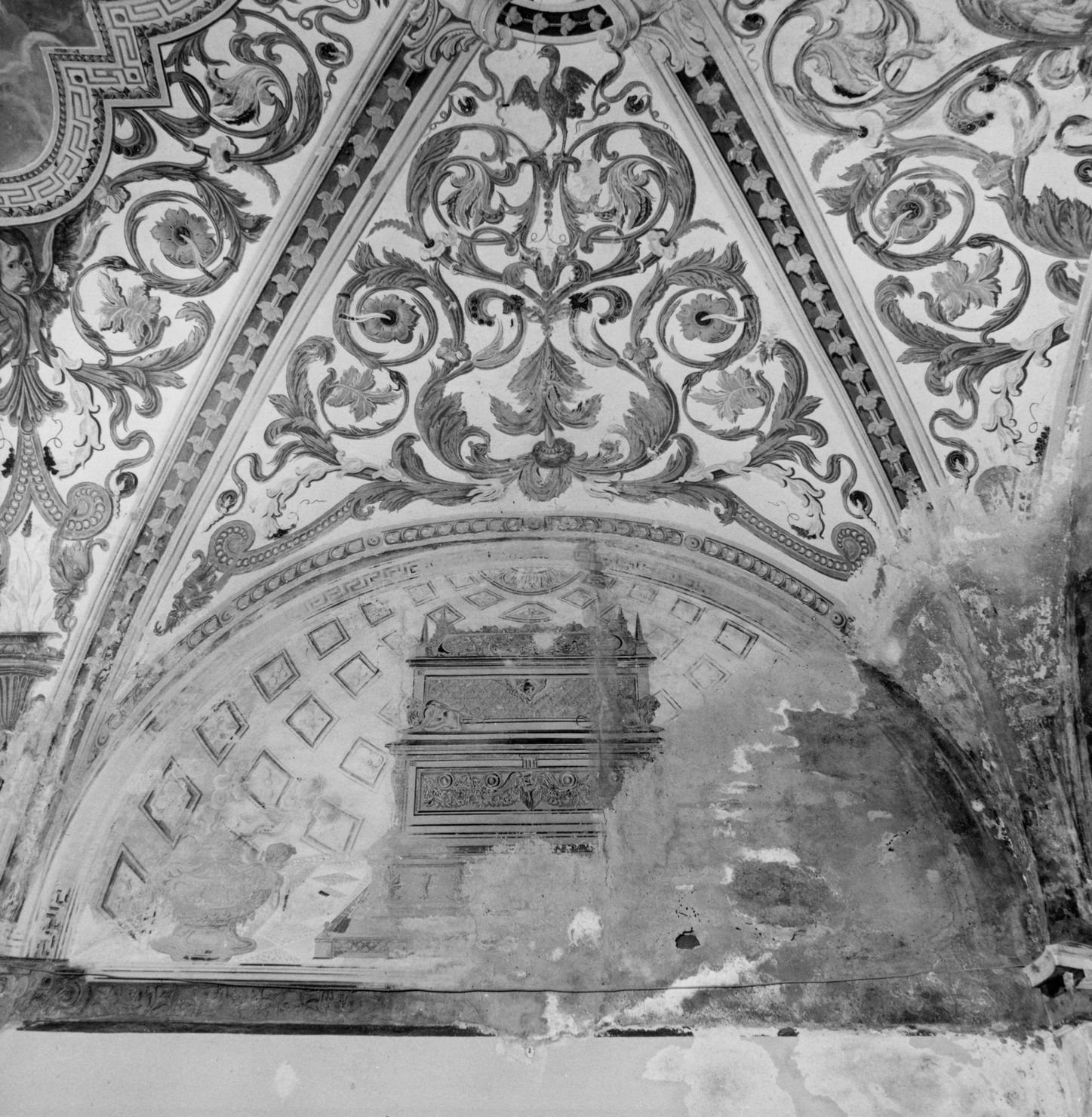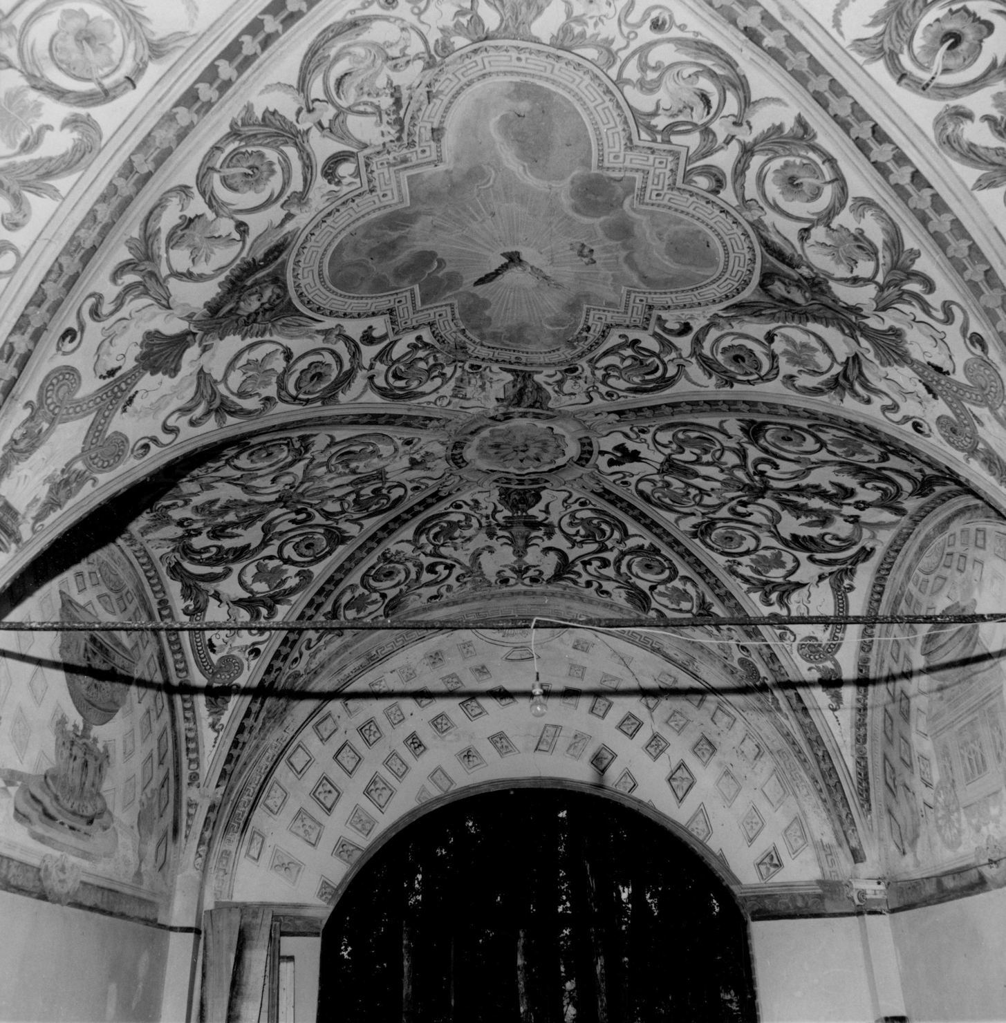 decorazione ad affresco del soffitto e delle lunette della volta. Le vele del soffitto sono incorniciate da motivi fitomorfi stilizzati lungo le nervature, la vela centrale romboidale è quella da cui si diparte la decorazione impostata da un polilobo con al centro colomba dello Spirito Santo. Le vele sono dipinte su fondo bianco con motivi a girali di acanto policromi; le lunette sono decorate da cassettoni a dipinti a illusione prospettica per dare la sensazione di un catino absidale e pavimento a fuga con tarsia marmorea su cui sono appoggiati elementi architettonici, carro, arche e vasi