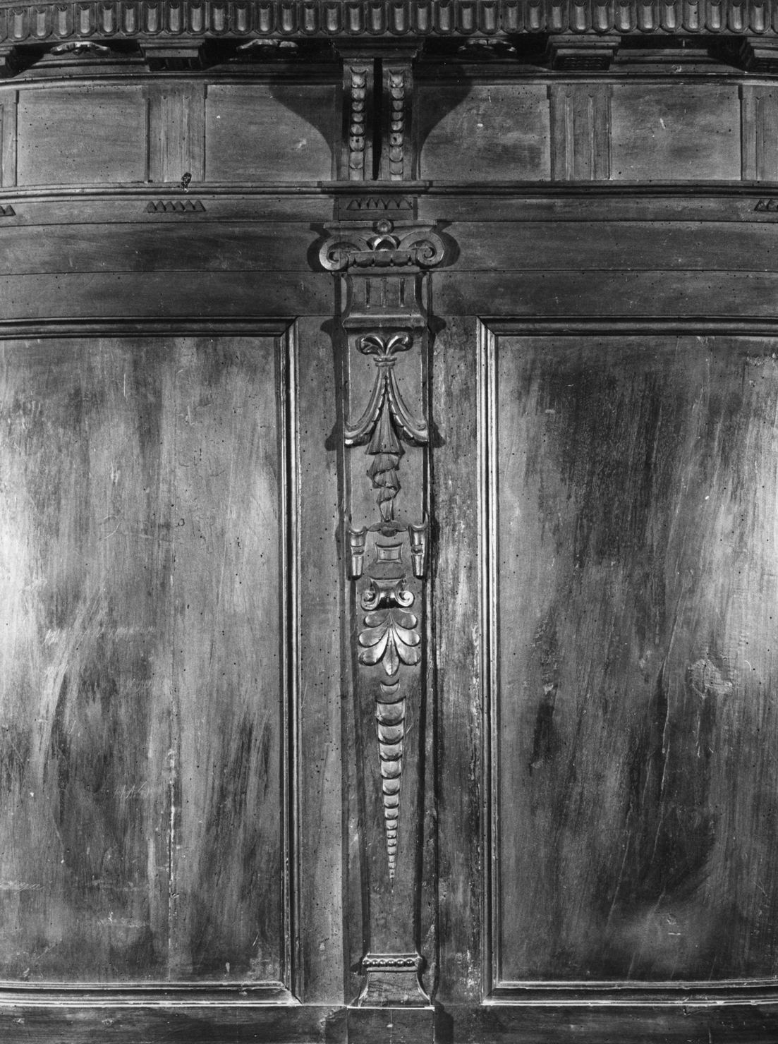 Il coro, formato da 24 stalli, occupa i quattro lati della cappella. Gli specchi degli stalli sono divisi da pilastrini intagliati con motivi decorativi a candelabra