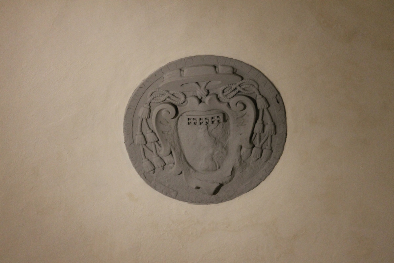 - STEMMI al centro della volta - Stemma - Falconcini - Scudo d'azzurro al monte di tre cime d'oro sostenente un falcone al naturale sorante, sormontato da tre gigli d'oro ordinati in fasce posti fra i quattro pendenti di un lambello di rosso