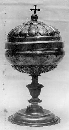 - NOTIZIE STORICO CRITICHE piede fusto e sottocoppa risultano omogenei e assegnabili all'i izio del Seicento, la tazza ed il coperchio soprattutto sembrano produzione locale dellaa prima metà del sec. XIX: la bottega è ancora quella del Razzuoli. Bei documenti dell'Opera si legge nel 'Saldo a tutto luglio 1821' di un intervento di Razzuoli a proposito di una pisside di once 15 '...importare di una coppa di pisside....avendosi consegnato la coppa vecchia....'
