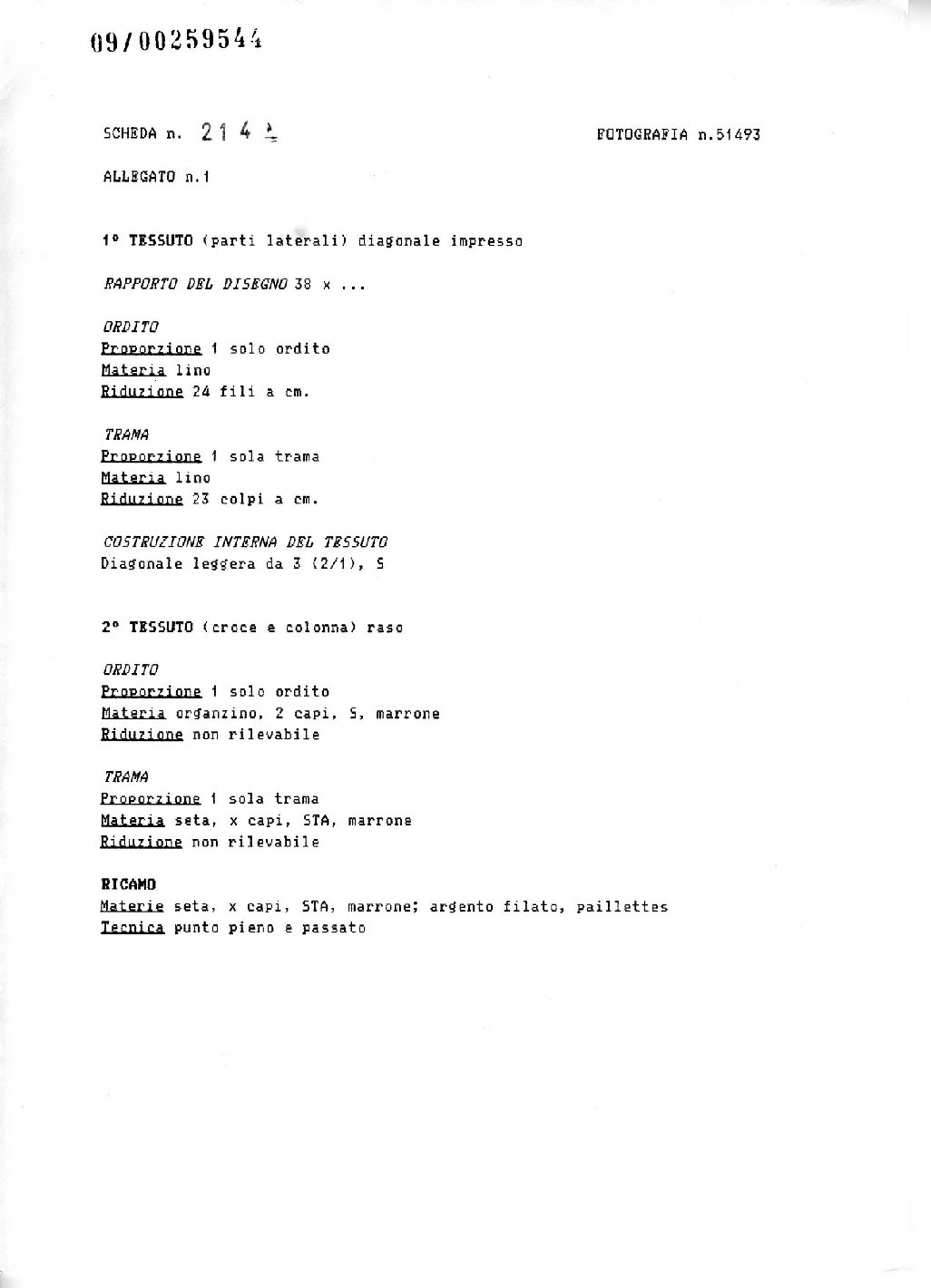 - NOTIZIE STORICO CRITICHE Questa pianeta chiamata "plicata" era usata insieme a un'altra uguale (AFS - SEZ BAS AR n. 53348) come testimonia il parroco, per le funzioni del VEnerdì Santo. Il Braun (G. Braun, I Paramenti Sacri, loro uso, storia e simbolismo, Torino, 1914, p. 96) ne descrive l'uso da parte di diaconi e suddiconi quando non dovevano usare la dalmatica o la tonacella. Il primo tessuto risulta molto comune nei patrimoni ecclesiastici toscani dove è possibile trovarlo anche in altre varianti di colore. Il disegno a rapporto molto ampio è simile a motivi più elaborati realizzati nel '700 in damasco di seta, fattore che insieme alla tecnica dell'impressione, fa orientare la datazione verso questo secolo (R. Orsi Landini, I paramenti sacri della Cappella Palatina di Palazzo Pitti, Firenze, 1988, n. 11). Il secondo tessuto è lo stesso usato per la confezione di un'altra pianeta presente in questo patrimonio (AFS SEZ BAS - AR n. 51508) e attribuibile a una manifattura fiorentina della fine del '700 e inizio '800 per i piccoli motivi distribuiti in modo distribuiti in modo dilatato sulla superficie della quale quindi prevale l'effetto delle larghe zone a tinta unita. Anche il gallone è settecentesco riprendendo una tipologia disegnativa tipica di questo secolo (R. Orsi Landini, cit., p. 40)