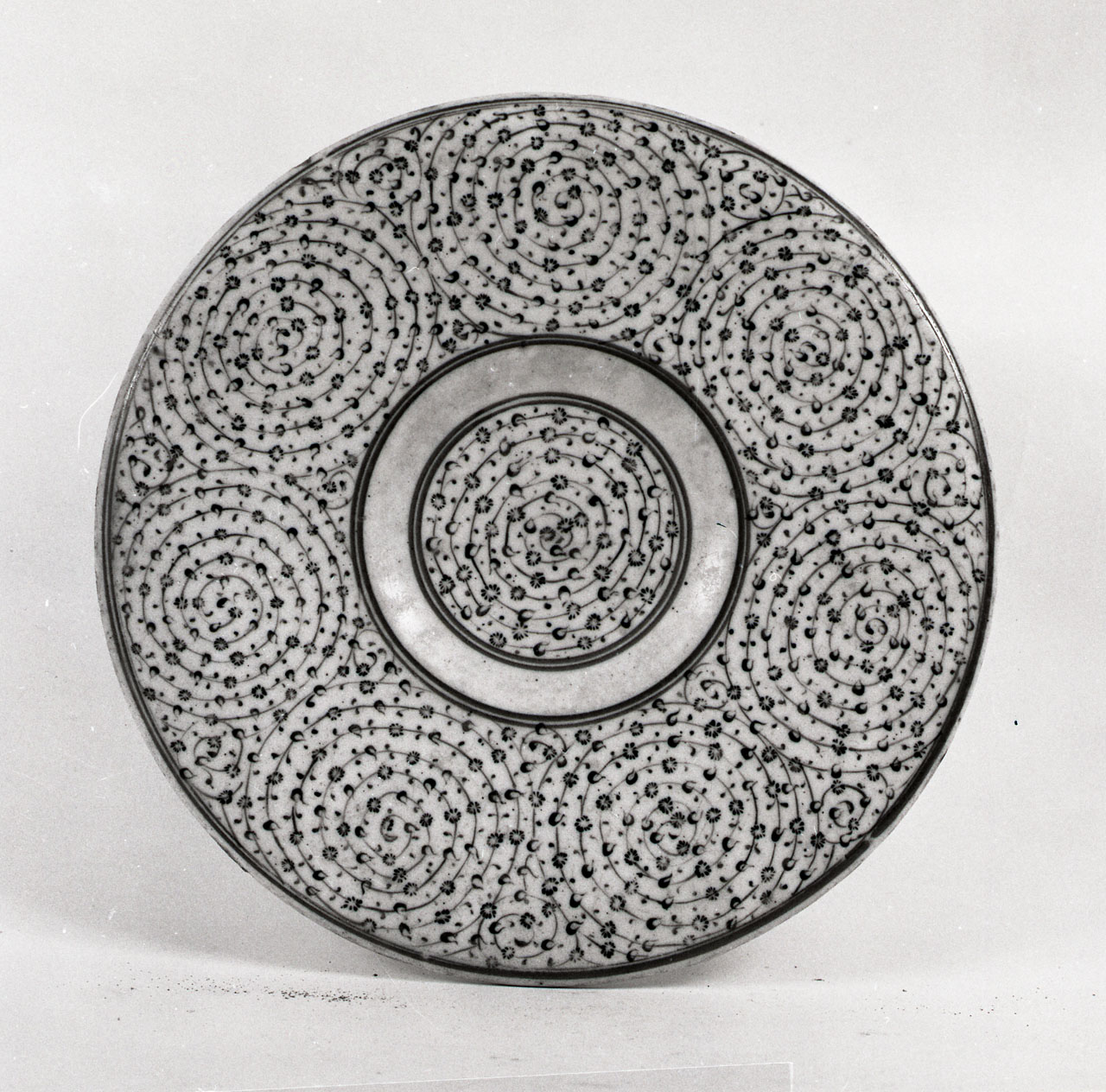 Piatto con ampia tesa obliqua, corta parete curva e fondo piatto in maiolica dipinta in turchino su smalto bianco. La superficie è interamente dipinta con un motivo calligrafico a volute costituito di linee che si avvolgono in lunghe spirali ripetute sette volte una accanto all'altra. Su queste linee sono dipinte foglioline e fiori stilizzati. Il verso è smaltato in bianco con filetti sottili 3+2 in blu