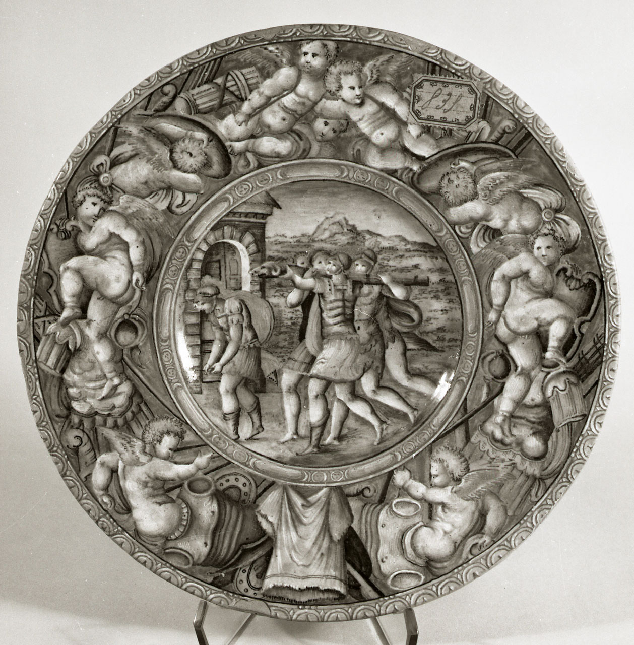 - NOTIZIE STORICO CRITICHE Il piatto ripropone l'esemplare di Pesaro, Bottega Fontana, c. 1550 in Mancini 1979, n. 221, ispirato ai disegni di Battista Franco per Guidobaldo della Rovere. Il piatto reca il marchio della Fabbrica Menaroni forse di Ferruccio Menaroni (1875-1925) nato a Pesaro, formatosi nella manifattura Molaroni di Pesaro e presso gli Altonibon a La Nave di Bassano; imparati i segreti della maiolica il giovane riprodusse per Molaroni i migliori esemplari della Collezione Mazza del quale il pezzo qui studiato faceva parte. Premiato nel 1908 alla Mostra nazionale delle Ceramiche di Faenza per il Tondo con La Madonna del Melograno da Botticelli e per il Trionfo di Cesare del Mantegna (ora a Pesaro, Musei Civici) l'artista si impose in seguito per le proprie creazioni