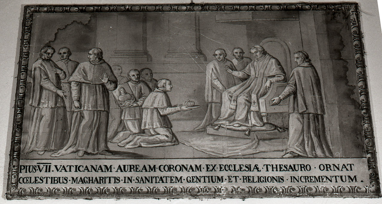 - ISCRIZIONI In basso - PIUS.VII. VATICANAM.AUREAM.CORONAM.EX.ECCLESIAE.THESAURO.ORNAT/COELESTIBUS.MARGHARITIS.IN.SANITATEM.GENTIUM.ET.RELIGIONIS.INCREMENTUM - ignoto pittore toscano - lettere capitali - a pennello -
