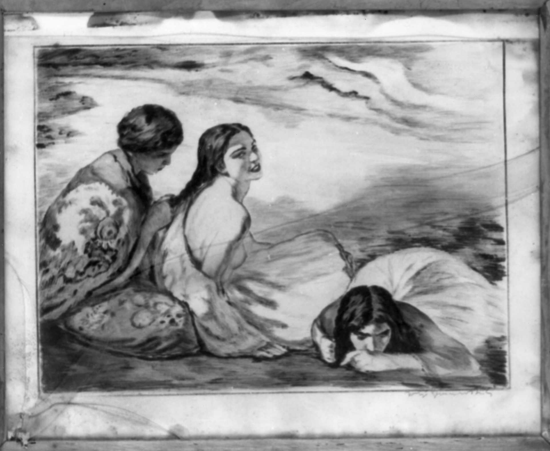 - NOTIZIE STORICO CRITICHE Secondo quanto attestano gli inventari municipali l'oggetto, proveniente dai magazzini del mercato, sarebbe opera di un "pittore ungherese": è difficile giudicare questa affermazione anche perché la firma è praticamente indecifrabile. Certo è che il soggetto, di gusto quasi esotico, rientra nella sensibilità che si sviluppa dalla fine del XIX secolo e che avrà fortuna sino agli anni Trenta. Litografia a due colori nei toni bruni raffigurante due donne in riva al mare, una delle quali, dalla veste fiorita, sta facendo la treccia all'altra. In basso, a destra una firma illeggibile. Cornice in legno chiaro