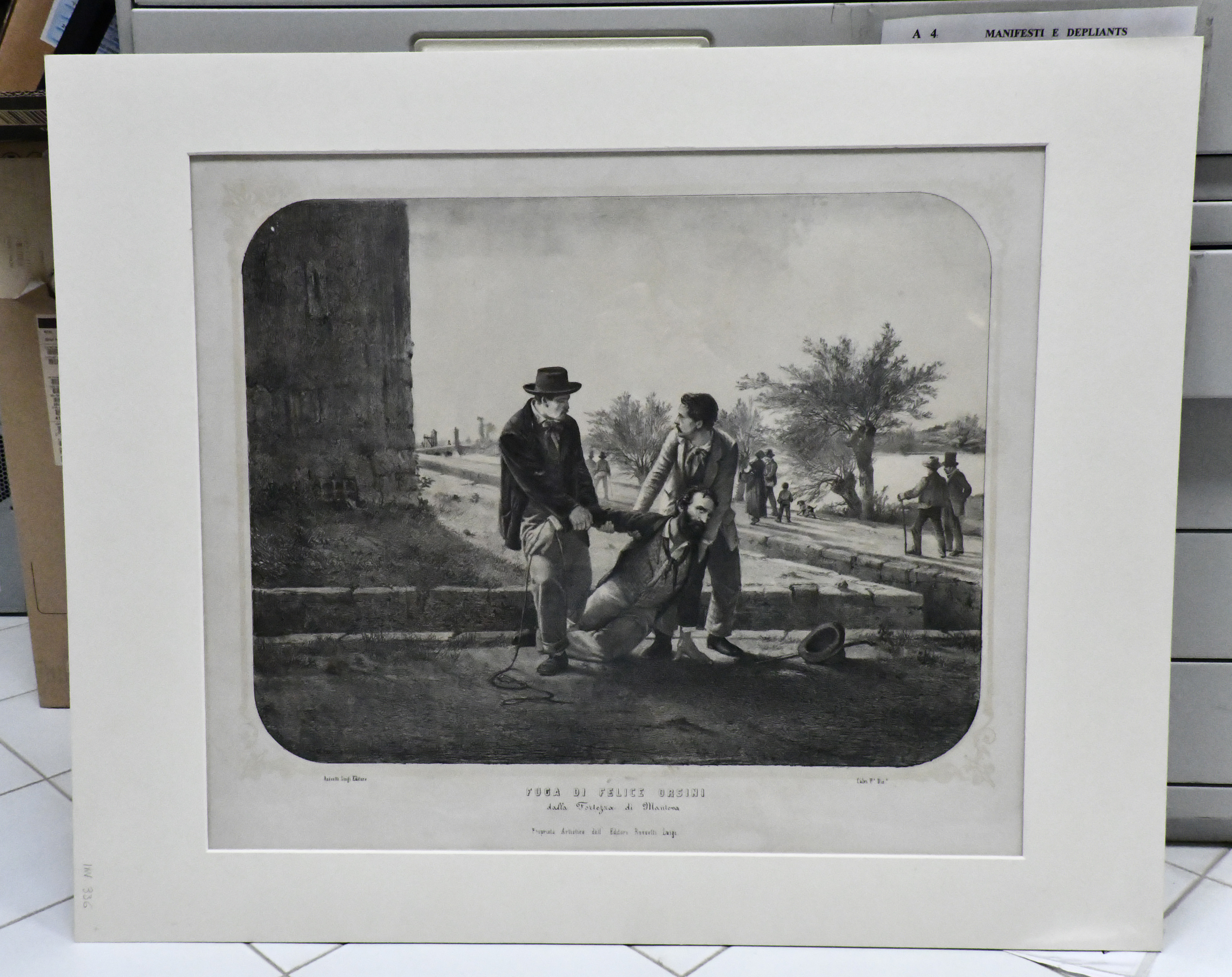 - NOTIZIE STORICO CRITICHE La litografia, proveniente dal fondo della Fratellanza artigiana, rappresenta la fuga di Felice Orsini (Meldola 1819 - Parigi 1858) dal carcere di Mantova, dove il patriota era stato imprigionato dagli austriaci. La tipologia dell'oggetto è riconducibile alla seconda metà dell'Ottocento. Litografia raffigurante la Fuga di Felice Orsini dalla fortezza di Mantova. In primo piano tre uomini, di cui l'Orsini accasciato, sono vicini al fossato della fortezza. In secondo piano diversi passanti vicino agli alberi. In basso il titolo e i dati del disegnatore ed editore