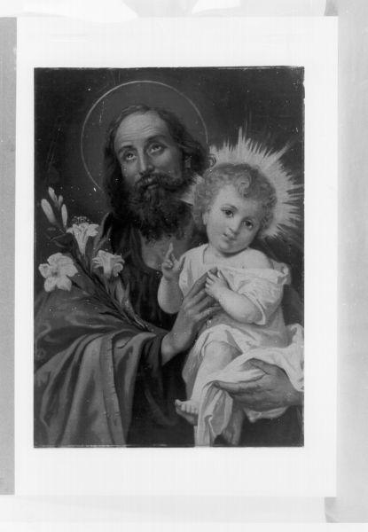- NOTIZIE STORICO CRITICHE La litografia, di ignota provenienza, presenta tutti i modi di raffigurazione ed i tratti edulcorati tipici dei soggetti sacri svolti tra la seconda metà e la fine Ottocento. Litografia a colori su carta raffigurante S. Giuseppe col bambino. il santo tiene gli occhi volti al cielo e presenta, tenendolo tra le braccia, il bambino che fa un gesto benedicente. Colori: verde, marrone, giallo, bianco, rosa