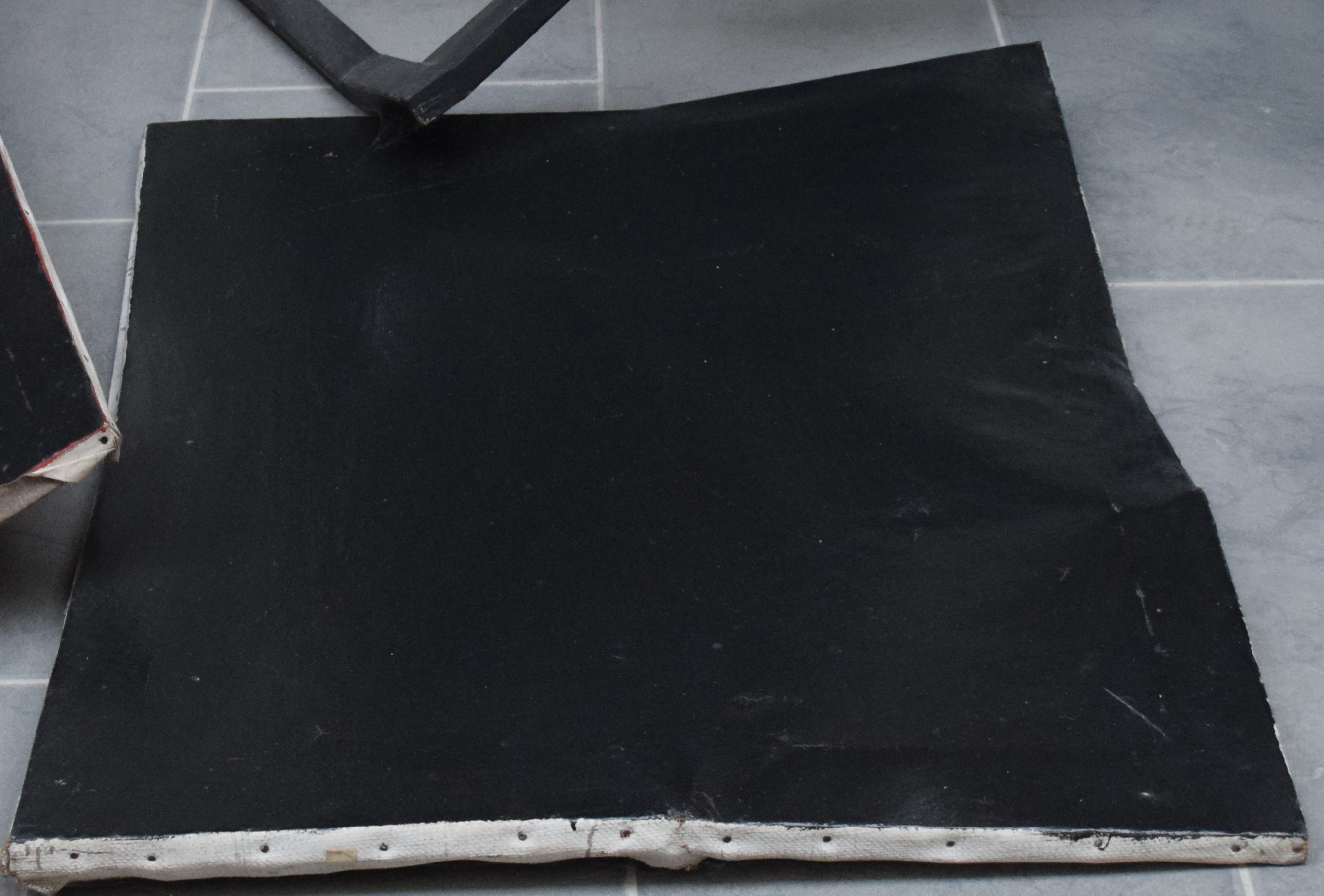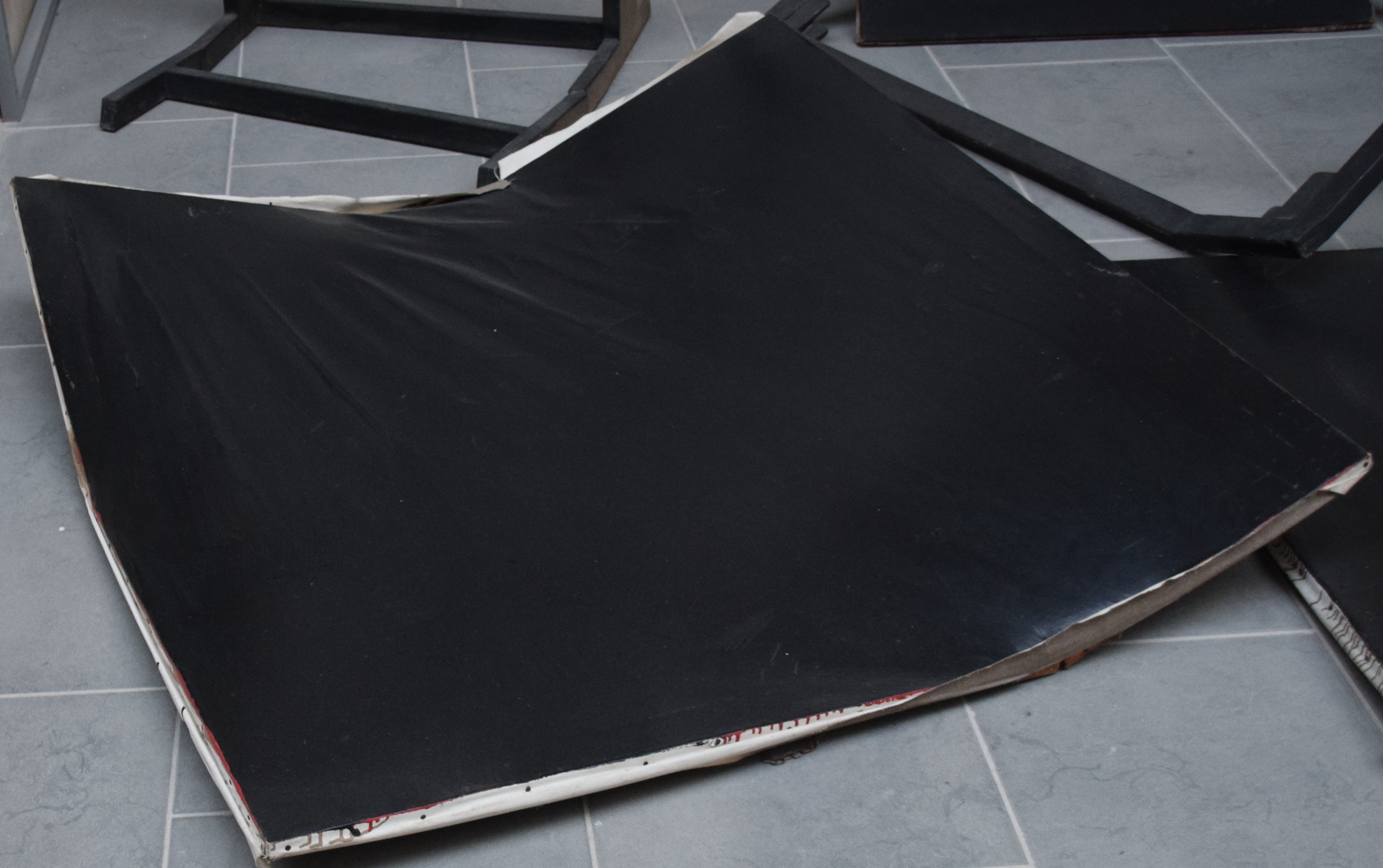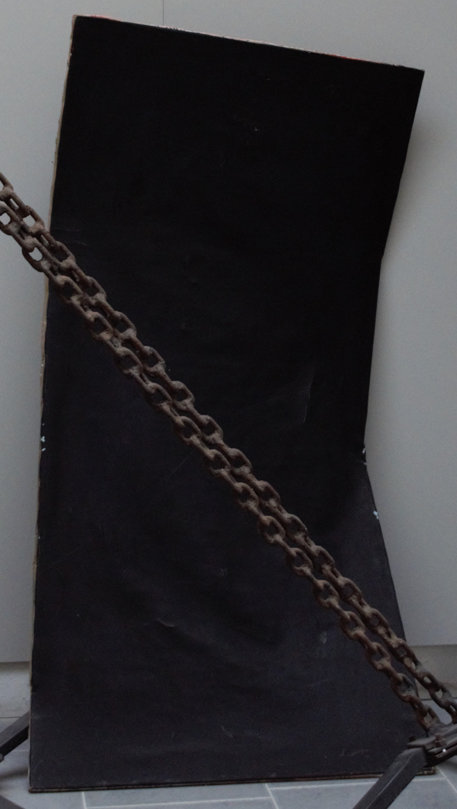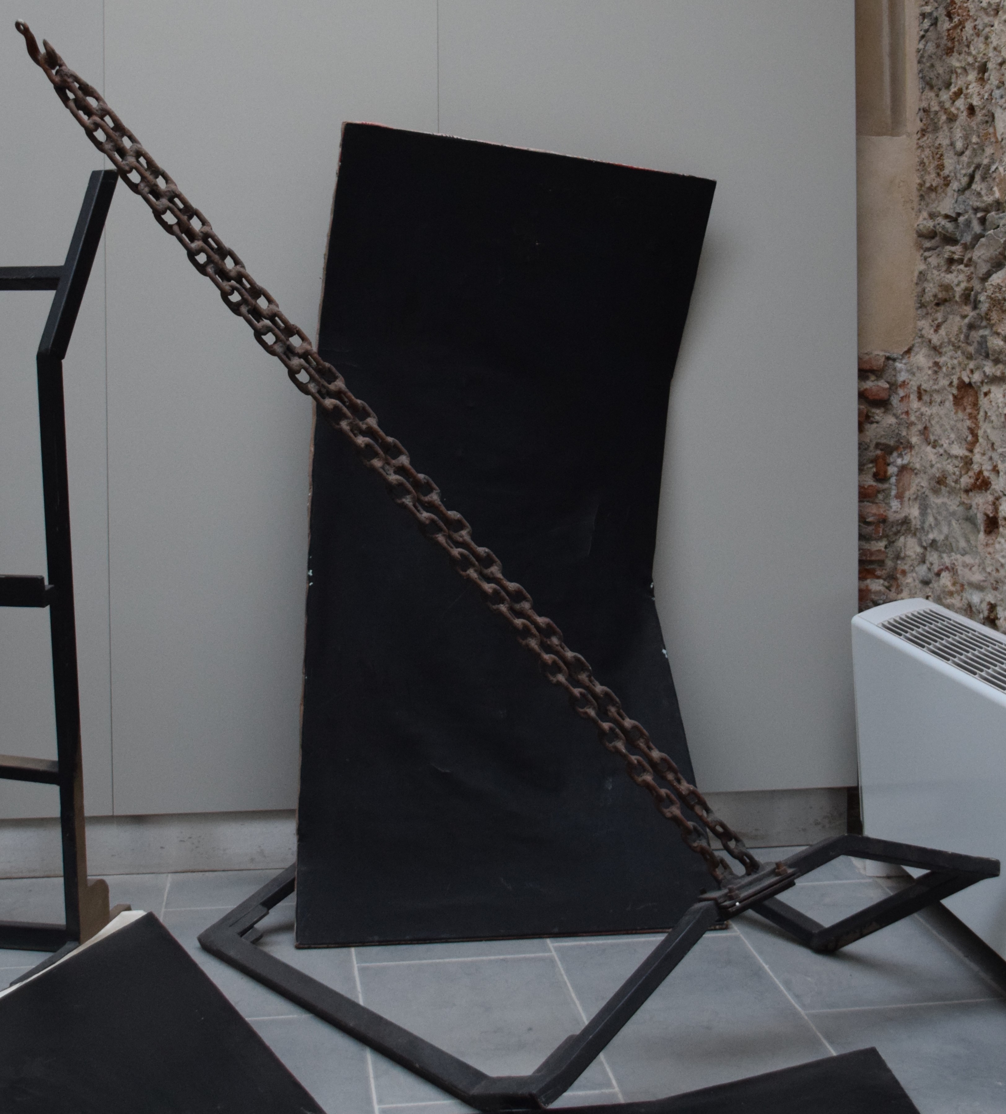 Installazione in ferro composta da un cavalletto in ferro da pittore verniciato di nero, un telaio incatenato, tre tele dipinte in nero monocromo con tela incernierati e spezzati