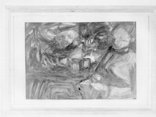 Dipinto a tempera su cartone raffigurante alcuni uomini seduti ad un tavolo sul quale sono dei bicchieri. Colori: bruno, verde. Sul retro i dati dell'opera; firmato e datato in basso a destra