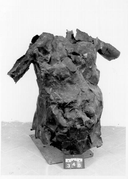 Scultura in lamiera di ferro a pezzi irregolari saldati a forma di un grande torso dal ventre prominente, con mezze maniche e acefalo