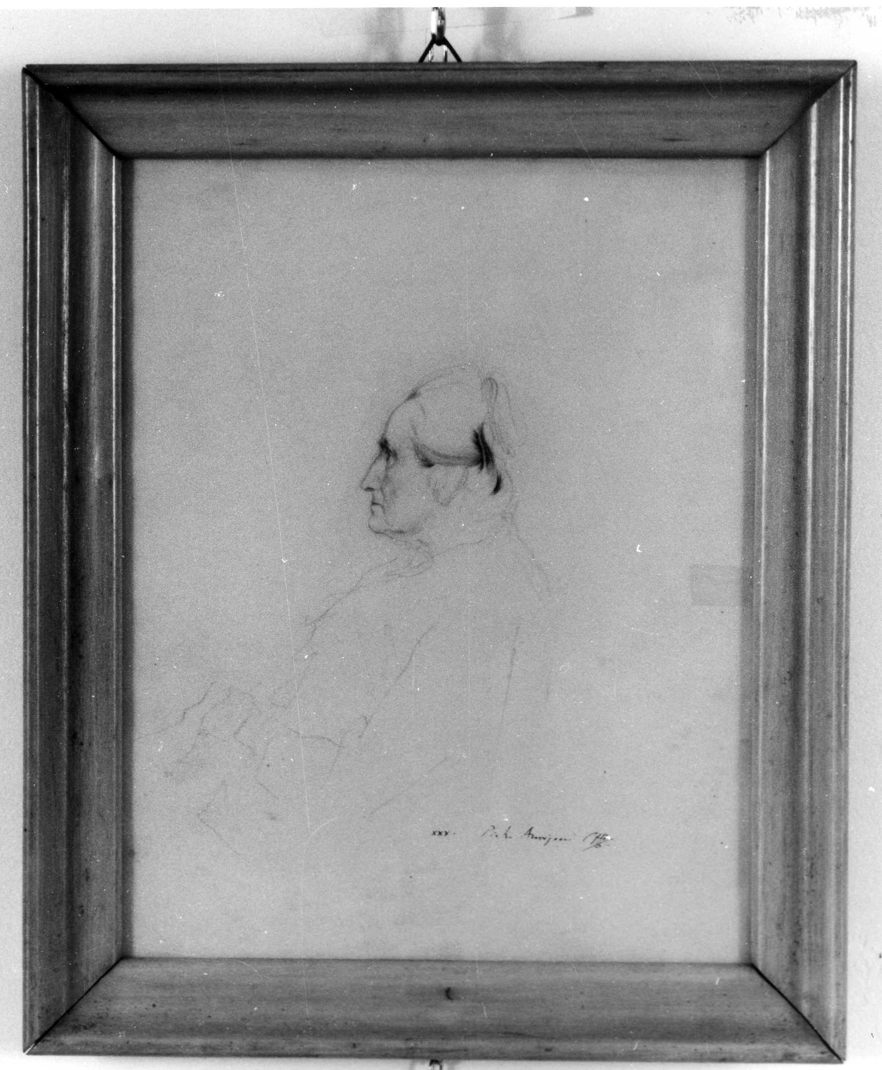 Disegno a matita su carta raffigurante un profilo di donna anziana. In basso, a china, la sigla XXX e la firma