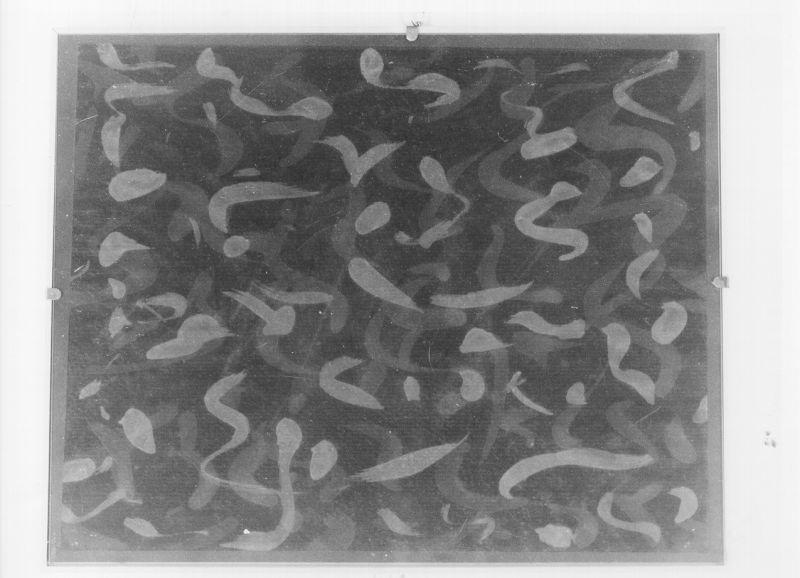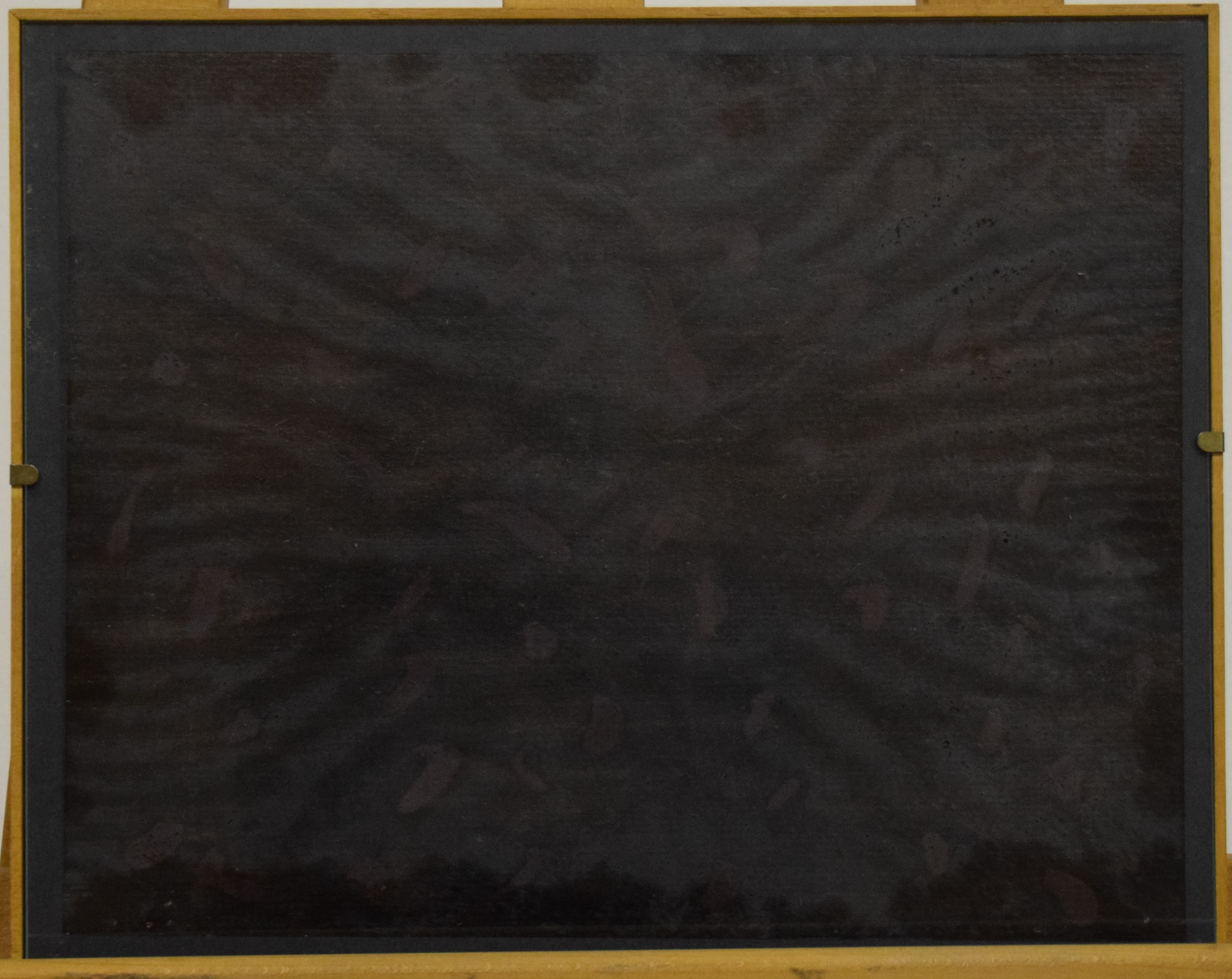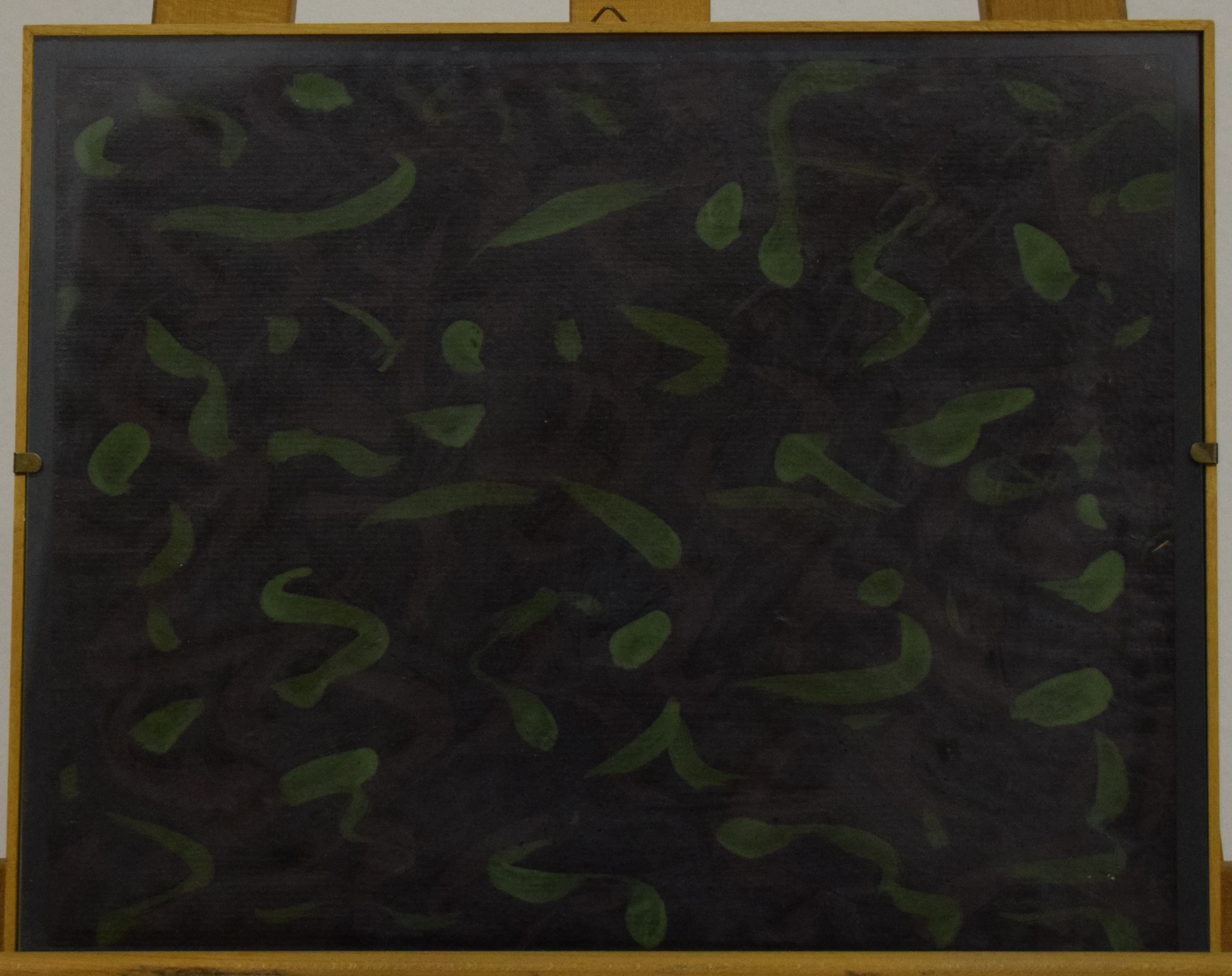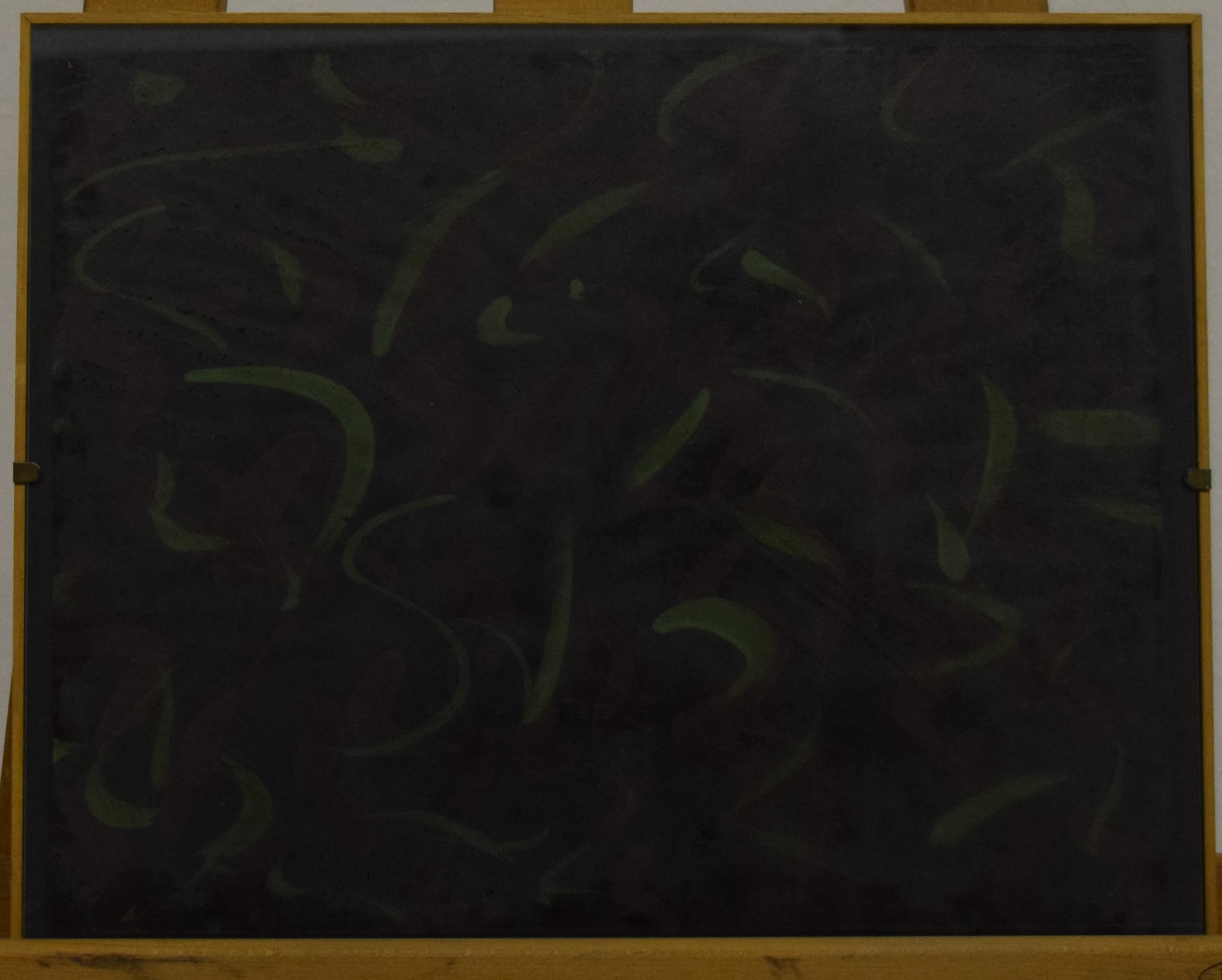Serie di quattro piccoli dipinti a tempera su carta composti da un fondo nero sul quale sono pennellate di colore violaceo, giallo e verde