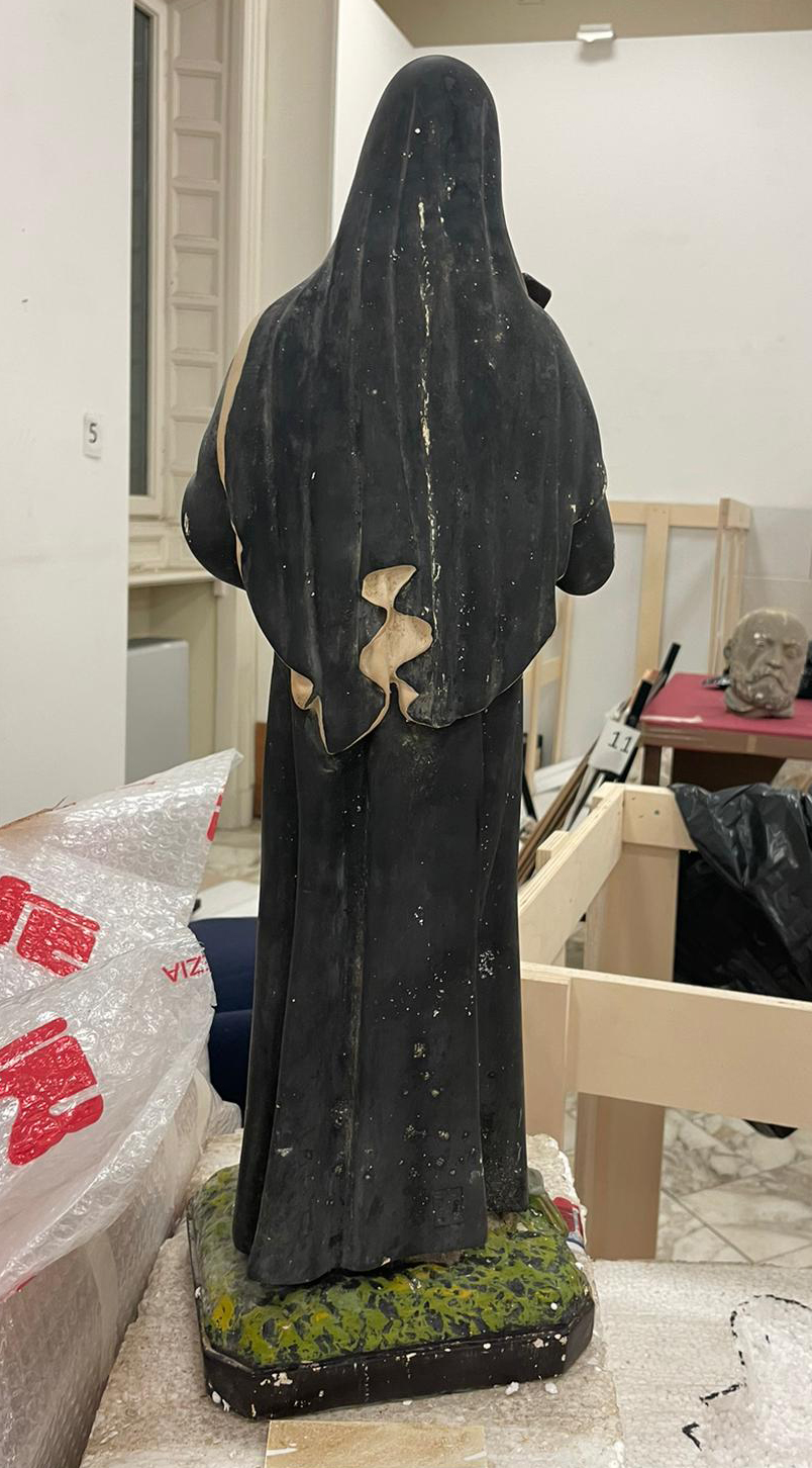 Statua in gesso dipinto in nero, verde, bianco, rosa raffigurante S. Rita. Poggiante su piccola base quadrata, la santa indossa una lunga veste nera e presenta un crocifisso