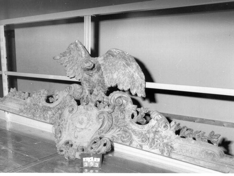 Fastigio in legno intagliato comprendente uno stemma centrale con il monogramma F C (?), decorazioni laterali fitomorfe con volute e alla sommità un'aquila volta verso destra