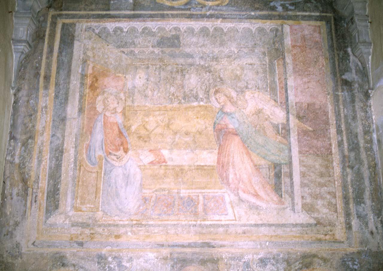 - NOTIZIE STORICO CRITICHE L'affresco riprende l'Annunciazione della Santissima Annunziata (cfr. scheda 09/00298899) la cui immagine si diffuse dalla seconda metà del XIV secolo in molte chiese di Firenze (cfr. gli affreschi di ugual soggetto a S. Marco, S. Maria Novella, Ognissanti, S. Lucia al Prato , S. Niccolò a Calenzano, ecc.) e dei dintorni ( cfr. l'Annunciazione di Agnolo Gaddi nel Duomo di Prato). Nel sotterraneo di S. Lorenzo ne esiste un'altra copia (cfr. scheda n. 0900288512)