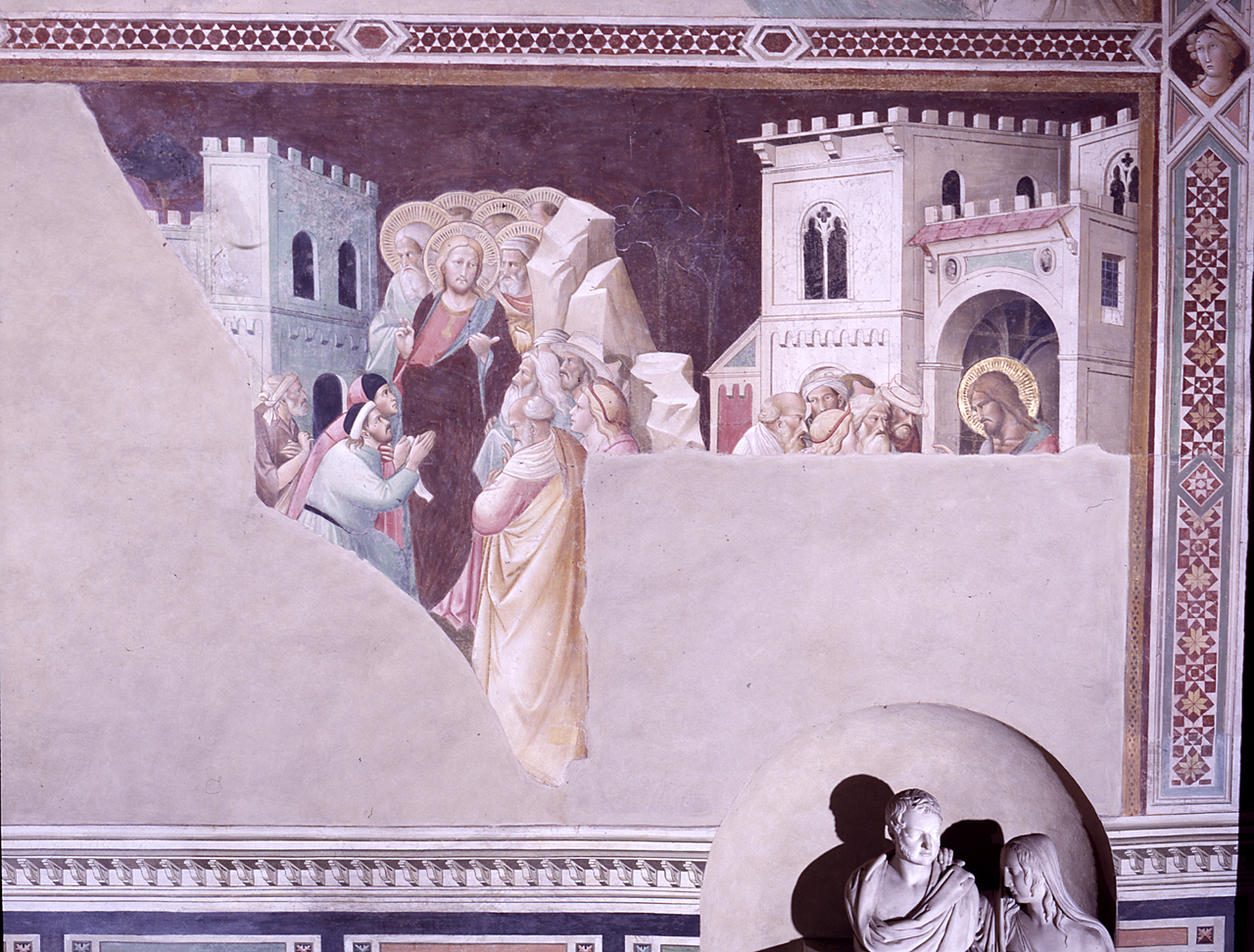 Personaggi: Cristo. Figure: astanti. Abbigliamento: contemporaneo; all'antica. Architetture: palazzi; torri; portico. Paesaggi: rocce. Piante: alberi