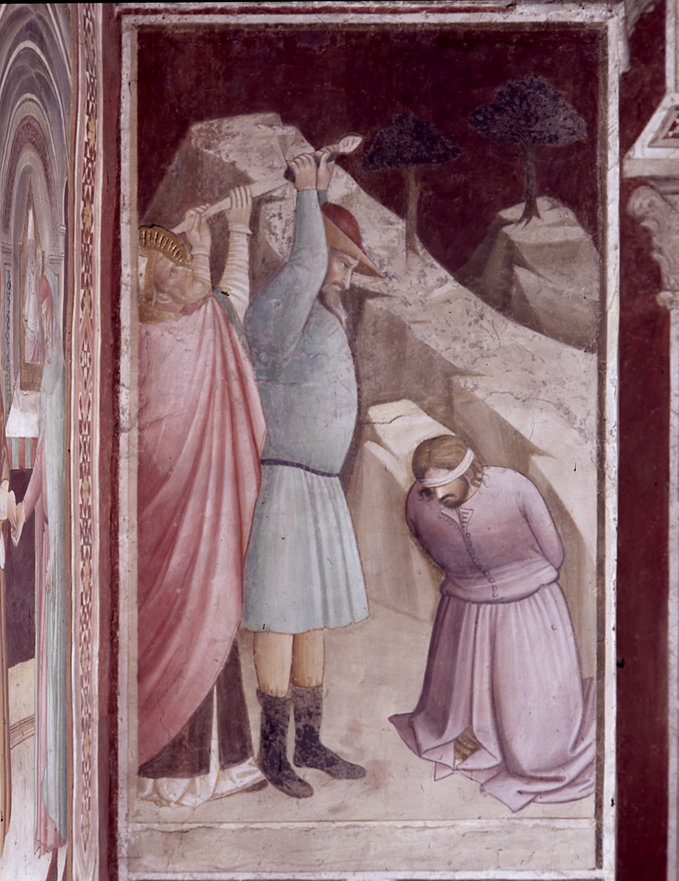 Personaggi: San Nicola di Bari. Figure: carnefice; condannato. Abbigliamento: contemporaneo; all'antica. Paesaggi: montagne. Piante: alberi. Armi: spada