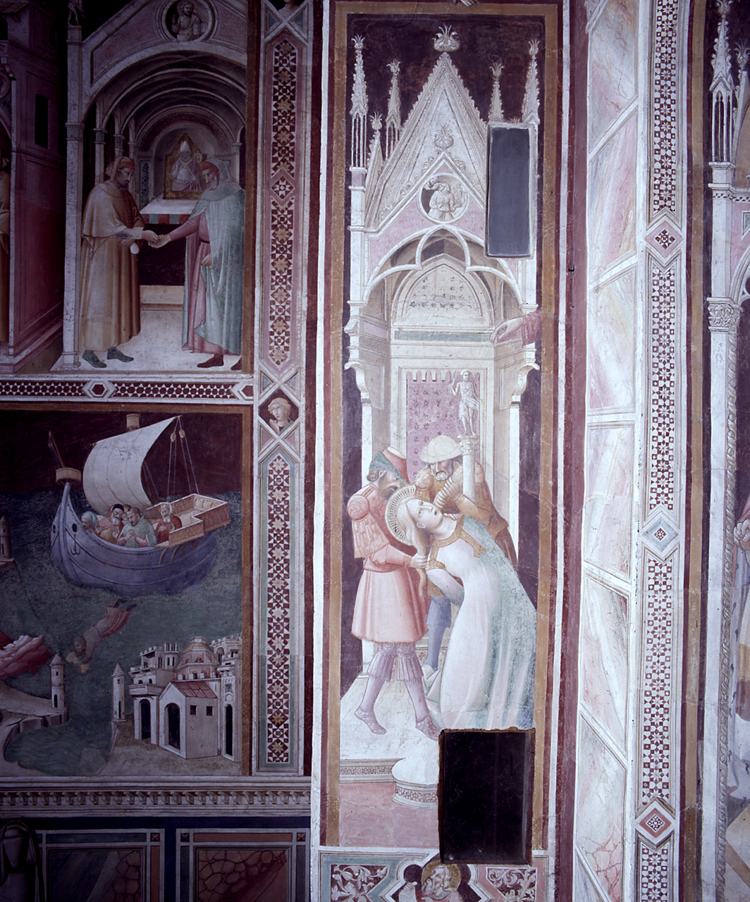 - NOTIZIE STORICO CRITICHE Il 9 luglio 1383, Michele di Vanni di ser Lotti de' Castellani, legava per testamento (Archivio di Stato di Firenze, Diplomatico, Monastero degli Angioli) mille fiorini d'oro per l'edificazione di una cappella in S. Croce destinata ad accogliere la propria sepoltura e quella del figlio Ranieri. Il Salvini, supponendo che sia trascorso un anno e mezzo per l'erezione della cappella, presume che la decorazione pittorica sia stata iniziata nel 1385. Mentre le fonti prevasariane assegnano ad Agnolo Gaddi oltre agli affreschi del coro "un'altra cappella", che non puo' essere che questa, il Vasari nomina come autore di "molte storie di Sant'Antonio abate in fresco" nella cappella Castellani, Gherardo Starnina. Ma e' attestato dalle carte relative agli affreschi della cappella del Sacro Cingolo, nel Duomo di Prato, che l'affrescatura della cappella era stata allogata ad Agnolo Gaddi e che la cappella Castellani era stato l'ultimo lavoro eseguito da Agnolo prima di quello di Prato. E' probabile che il lavoro prendesse avvio nella campata dell'altare, dove le scene relative al Battesimo di Cristo (in gran parte rovinate), presentano aspetti simili a quelli delle storie autografe del coro. Le fonti antiche, come gia' accennato, discordano sull'autografia degli affreschi (vd. Vasari, ad esempio, che oltre ad attribuirli a Gherardo Starnina,li dice eseguiti anteriormente al tumulto dei Ciompi del 1378, perche' intorno a quegli anni Gherardo Starnina si reco' in Spagna, al seguito di alcuni mercanti spagnoli che avevano molto ammirato i suoi affreschi della Castellani). Gia' nel 1600 la decorazione delle pareti era scomparsa sotto calce (vd. Bocchi-Cinelli, 1677) e non rimaneva che la decorazione della volta. Nel 1870 si cominciarono a fare saggi sulle pareti della cappella e vennero alla luce gli affreschi. Nel 1921/1922, gli affreschi vennero rimessi in luce e restaurati dal prof. A. Benini (in occasione del centenario dantesco), pur non potendo recuperare, se non parzialmente, quelli della zona inferiore. E' da supporre che la dipintura della vasta cappella non sia avvenuta tutta di seguito, ma abbia subito ad un certo momento una interruzione. Ritroviamo, infatti, la mano di Agnolo nelle tre composizioni della parete sinistra della prima campata