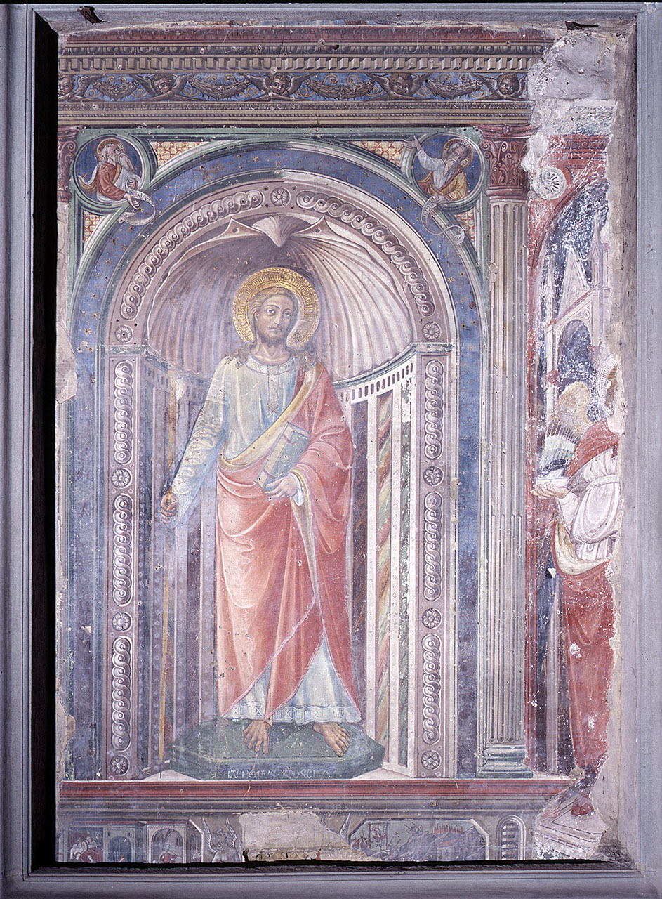 Soggetti sacri. Personaggi: San Giacomo Maggiore; Isaia; Giacobbe. Attributi: (san Giacomo) conchiglia; bordone. Oggetti: libro. Architetture: basamento; nicchia. Decorazioni: motivi a treccia; rosette; pareti a finto marmo; semipilastri dipinti di ordine corinzio; modanature; dentelli