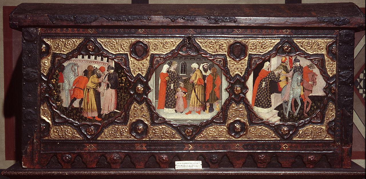 - NOTIZIE STORICO CRITICHE Il cassone, proveniente da Santa Maria Nuova, con l'acquisto di opere d'arte fatto dall'allora Ministero della Pubblica Istruzione nel 1900, presenta nel fronte tre formelle polilobate e dipinte a tempera; ciascuna di esse illustra un'episodio tratto dalla novantanovesima novella del "Decamerone" di Boccaccio, la storia di Saladino e messer Torello d'Istria. Le scene raffigurano "Messer Torello che riceve Saladino e i suoi compagni", "la moglie di Torello che dona un cambio di indumenti a Saladino" e "Torello che riceve in dono l'anello dalla moglie". Non ci sono dubbi circa l'identificazione della novella narrata che lo Schubring (1923), studiando per primo il cassone, aveva erroneamente ritenuto la storia di Mattabruna. Si deve a De Nicola l'esatta identificazione delle storie raffigurate con episodi tratti dalla novella di Meser Torello del Decamerone di Boccaccio. Vista l'incompletezza della vicenda il De Nicola suppose anche la presenza di un altro cassone, con il preseguo della storia. Ipotesi che si è rivelata veritiera in quanto un cassone pubblicato da Borenius e attualmente presso la fondazione Cini di Venezia risulta essere il pendant del cassone del Bargello. La critica generalmente assegna l'esemplare del Bargello ad una bottega fiorentina attiva agli inizi del Quattrocento. Più precisamente De Nicola riferisce il manufatto ad un pittore locale, scolaro di Lorenzo di Niccolò e Niccolò di Pietro Gerini; Berenson lo assegna ad un seguace di Maso di Banco. Infine Watson colloca il cassone del Bargello ed il suo "pendant" veneziano nell'ambito della cultura fiorentina del primo Quattrocento e, rintracciando nei due esemplari moduli stilistici desunti da Lorenzo Monaco, data i pezzi al 1420 circa. Un cassone analogamente decorato a pastiglia e con formelle polilobate racchiudenti gli stessi episodi dipinti é conservato al Museo Stibbert e lo Schubring ritiene che si tratti di una copia di epoca successiva. Anche recentemente il cassone è stato oggetto di attenti studi e riferito da Bologna all'ambito napoletano dell'inizio del Quattrocento; precisamente lo studioso lo riteneva eseguito in occasione delle nozze di Ladislao di Napoli e Maria di Enghien nel 1407. Il Boskovits lo ritiene opera di un artista fiorentino operoso tra tre e Quattrocento, legato a questo ambito napoletano, tanto da essere denominato Maestro di Ladislao Durazzo