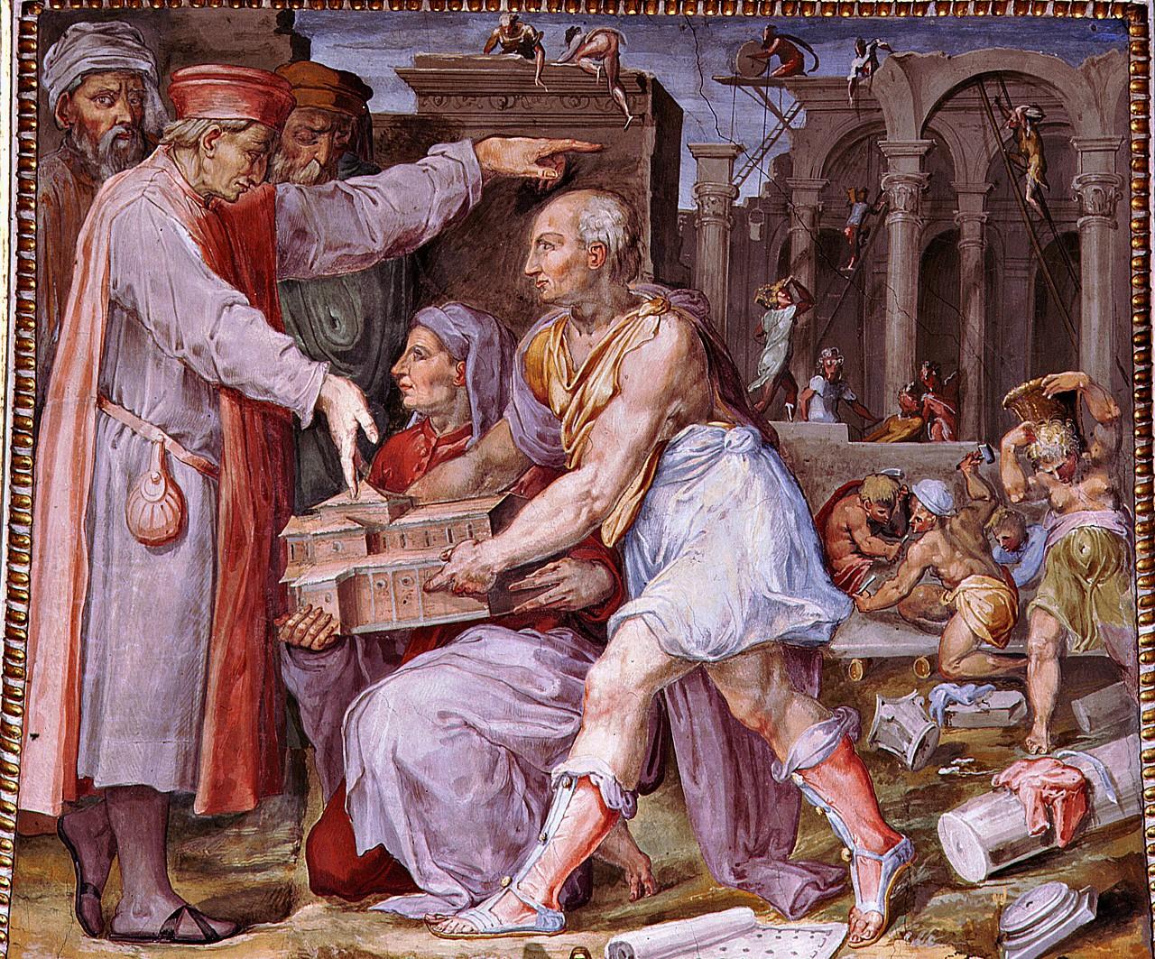 - NOTIZIE STORICO CRITICHE Il Vasari forni' il progetto per il dipinto come è confermato dal disegno del Louvre, ma la sua esecuzione è dovuta a Marco da Faenza che nella sala si rivela piacevole pittore di storia. Nel riquadro e' celebrato l' interessamento di Cosimo nei confronti dell'arte ed e'raffigurata la costruzione della chiesa di San Lorenzo. In primo piano di fronte a Cosimo sono rappresentati il Brunelleschi e il Ghiberti con il modello ligneo della chiesa
