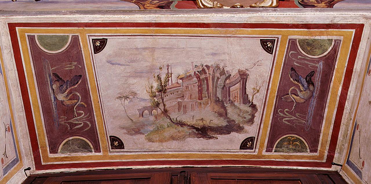 - NOTIZIE STORICO CRITICHE Marco da Faenza e' l'autore della decorazione della volticcciola dell' imbotte con una vedutina di rovine, tipico del repertorio a grottesca trattate con una tecnica che si richiama allo stile " compendiario" antico