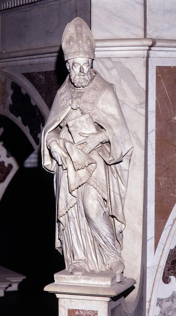 - NOTIZIE STORICO CRITICHE Questa statua fa parte di un gruppo di quattro raffiguranti, oltre a Sant'Agostino, San Giovanni evangelista (cfr. 09/00281786 liv. 6.4), San Giovanni Battista (cfr.09/00281786 liv. 6.3) e San Pietro (cfr.09/00281786 liv. 6.2). Secondo la Caneva, (Il Seicento fiorentino. Biografie), che attribuisce al Caccini tutti e quattro i santi, la statua del Battista è da considerarsi la migliore. Schmidt, di cui accettiamo le ipotesi, sostiene, a proposito di questo gruppo, che il San Giovanni Battista e il San Giovanni evangelista dal punto di vista stilistico sarebbero da ascrivere a Gherardo Silvani, mentre il San Pietro e il Sant'Agostino sono di scuola del Caccini su modello del Caccini medesimo, e avvicina il Sant'Agostino al San Zanobi del Caccini in Santa Maria Maggiore. Il Venturi (Storia, X, 3, 1937, p. 810) erroneamente identifica come San Zanobi questa statua di Sant'Agostino