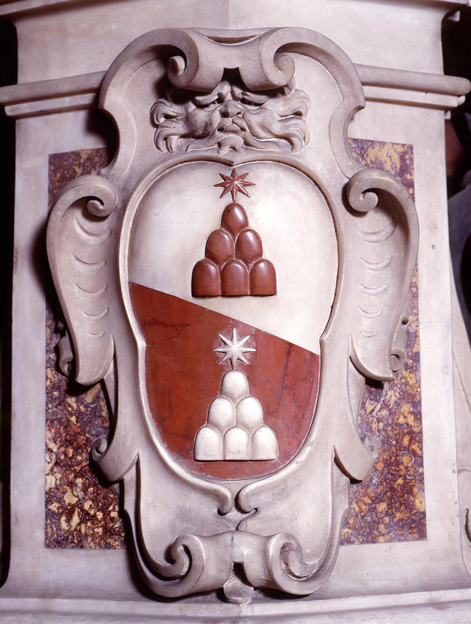 Oggetti: scudi araldici. Decorazioni: cornice a maschere; grottesche