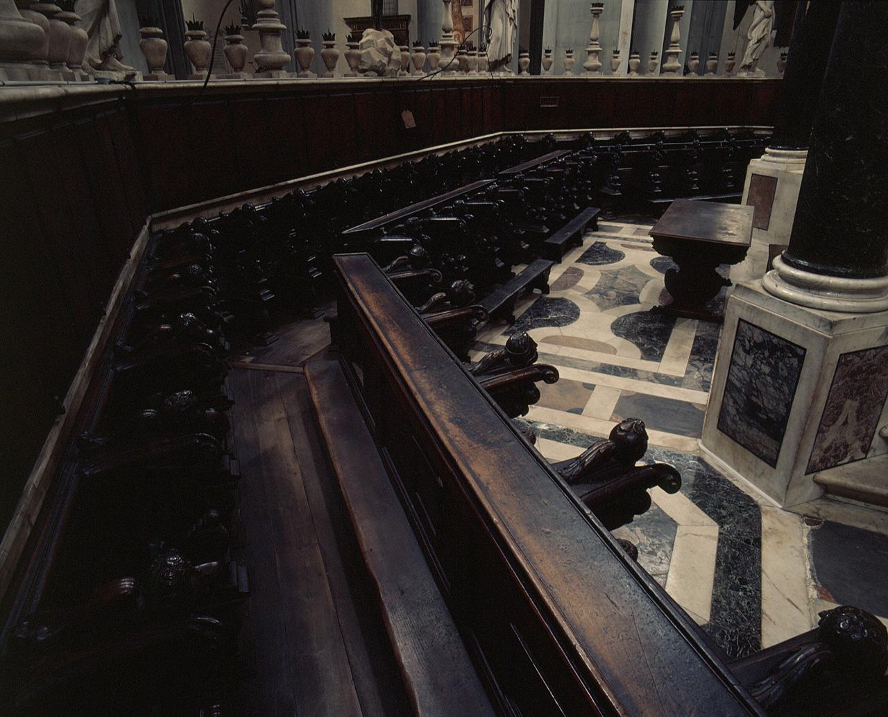 - NOTIZIE STORICO CRITICHE Non si hanno notizie precise su questo coro tranne che per la brevissima notazione dei Paatz che lo dicono eseguito su progetto del Caccini, e lo studio di Schmidt dove si afferma che il Michelozzi commissiono', insieme all'altare maggiore, anche il coro dove, d'altro canto, la ricorrenza dello stemma Michelozzi induce a ritenere che esso faccia parte di un complesso unitario insieme all'altare maggiore al quale si rimanda per ulteriori notizie (cfr. 09/00281786 liv. 0). Il Tinti ascrive invece il coro a Giovanni Montorsoli senza fornire la ragione di tale attribuzione. Essendo pero' il Montorsoli morto gia' nel 1564, questa tesi non e' sostenibile