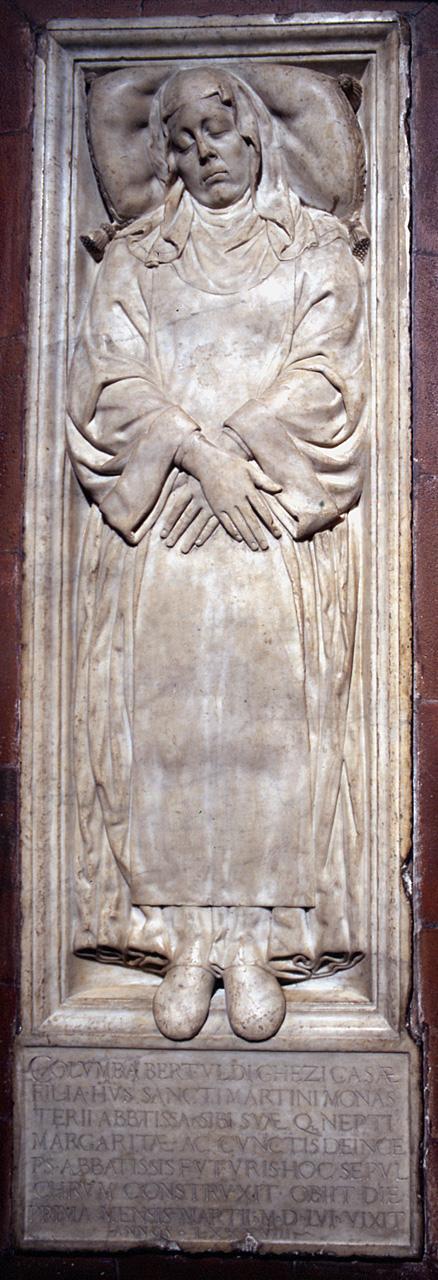 - NOTIZIE STORICO CRITICHE La lastra tombale raffigura la badessa del monastero femminile di S. Martino alla Scala. Ella mori' nel marzo 1567 (1566 secondo lo stile fiorentino), ma la lastra tombale venne commissionata da lei vivente a Francesco da Sangallo, gia' nel 1540, come attesta una registrazione a quella data nel Libro delle Ricordanze del monastero, conservato all'Archivio di Stato e pubblicata dal Poggi. L'opera e' da considerarsi tra quelle della piena maturita' di Francesco da Sangallo ed e' giudicata dal Middeldorf (1938) piu' debole qualitativamente rispetto al monumento funebre del vescovo Leonardo Buonafede della Certosa (1550)
