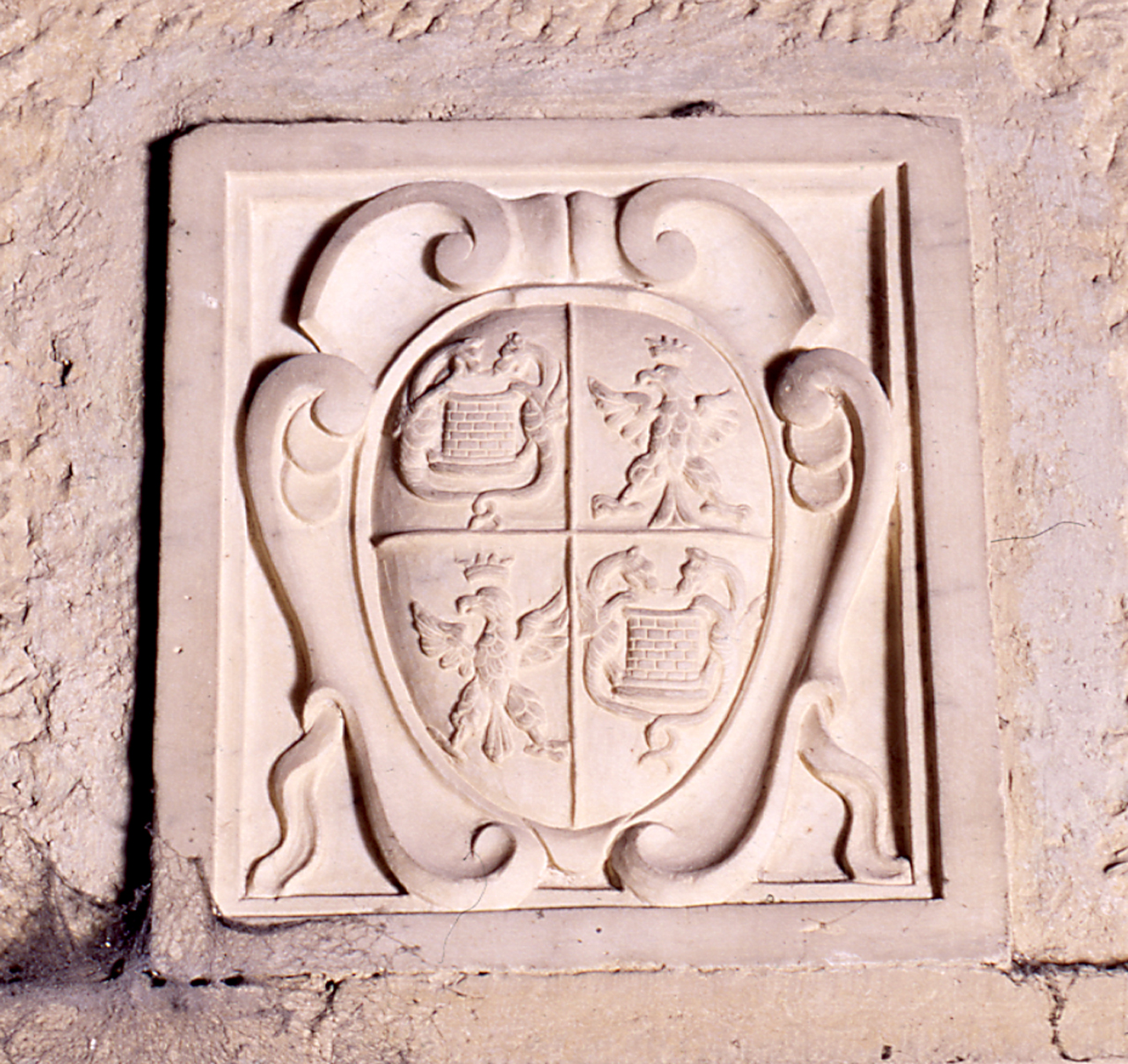 Araldica: scudo; cartiglio. Decorazioni: foglie; modanature