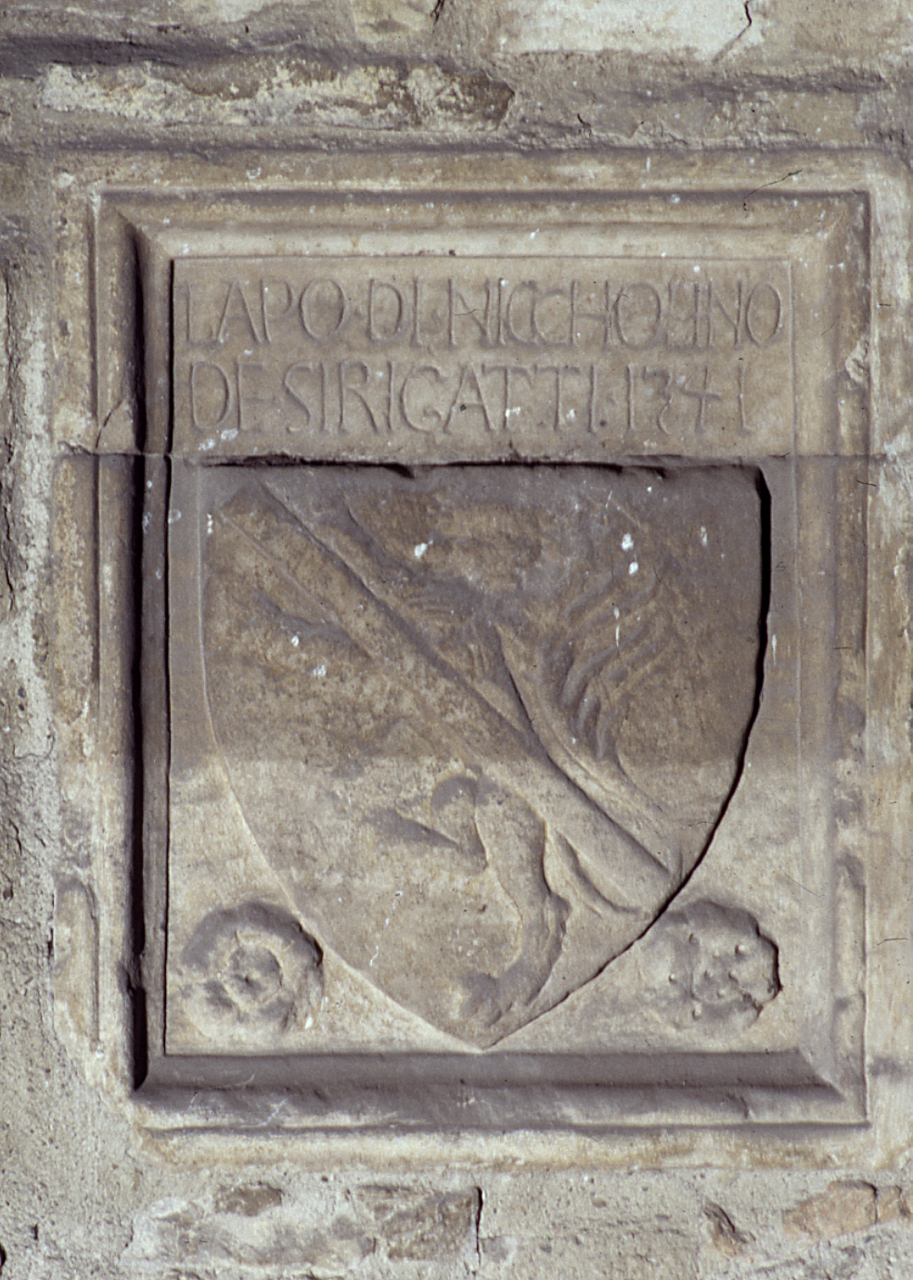 - NOTIZIE STORICO CRITICHE Rosselli segnala ben tre casi in cui la famiglia di Lapo Niccolini Sirigatti ha acquistato sepolture in questo loggiato appartenenti in precedenza ad altre famiglie. In tutti i casi la sepoltura é stata instestata appunto a Lapo, fondatore del ramo. Questo fa pensare che l'anno 1341 si riferisca alla sua morte o alla fondazione della sepoltura ma non all'anno di esecuzione della lapide, cosa peraltro comune nei secoli XIV e XV, come hanno dimostrato la Chiti e la Jacopino. In quanto alla lapide stessa essa é databile entro il XIV secolo eccezione fatta per l'iscrizione in caratteri capitali, aggiunta o rifatta successivamente come si puó notare osservando il taglio lineare che percorre il marmo tra l'arme e l'iscrizione stessa. Essa risponde inoltre ai canoni stilistici delle iscrizioni sepolcrali della seconda metá del '400. I sepoltuari segnalano che il luogo di sepoltura apparteneva precedentemente a Lando da Meleto e discendenti: il Rosselli informa che l'arme disfatta di questa famiglia é ancora visibile nel 1657