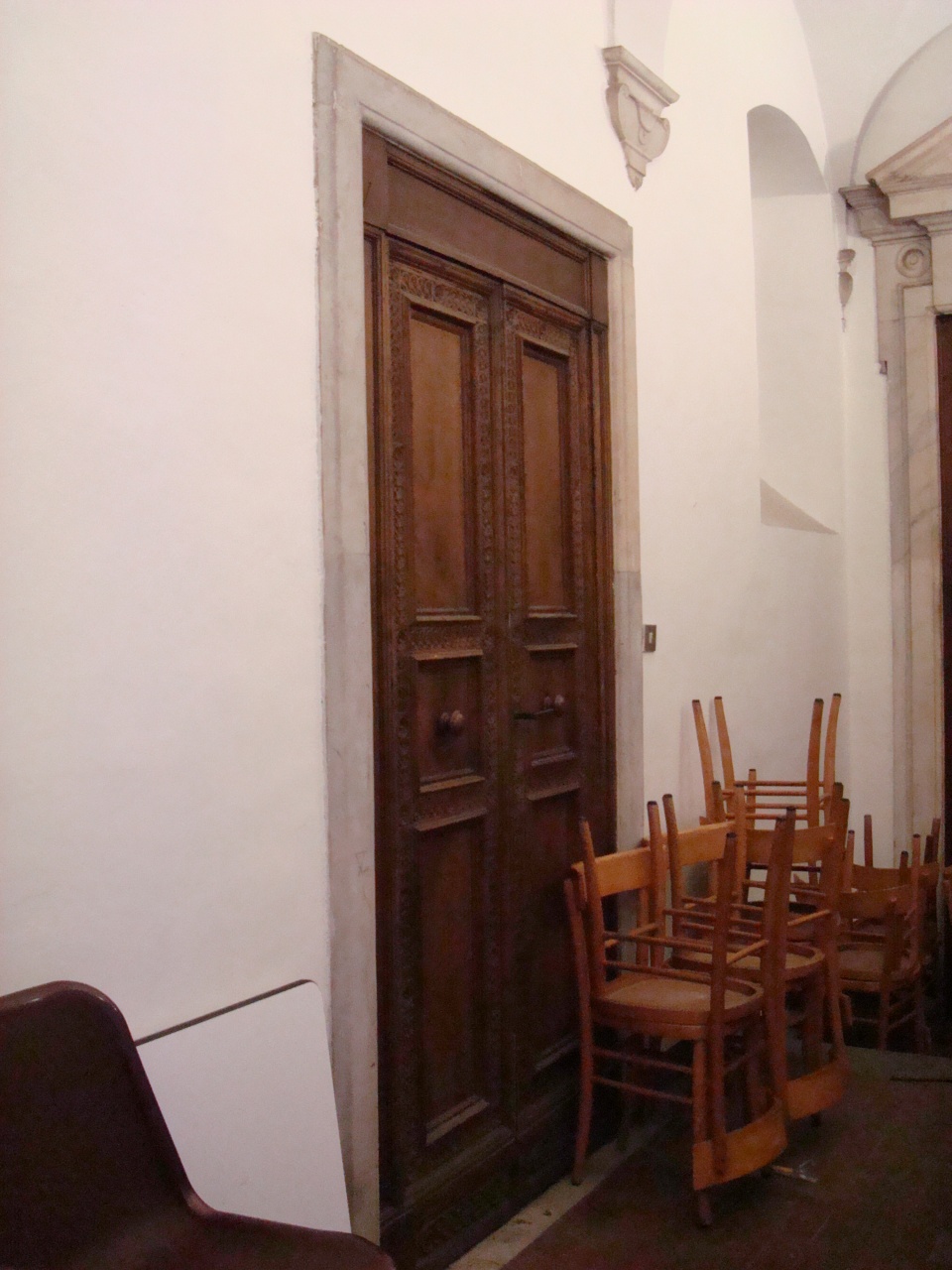- NOTIZIE STORICO CRITICHE L'ambiente in cui si trovano, ora adibito a cartoleria, e' attiguo alla cappella di S. Antonino o Salviati e fu concepito insieme ad essa, eretta tra il 1578 ed il 1589 su progetto del Giambologna(scheda 18664). La datazione suggerita per questoportale e' suggerita dalla data apposta sull'architrave del portale delle pareti destra e sinistra della cartoleria (schede 18670 e 18675)