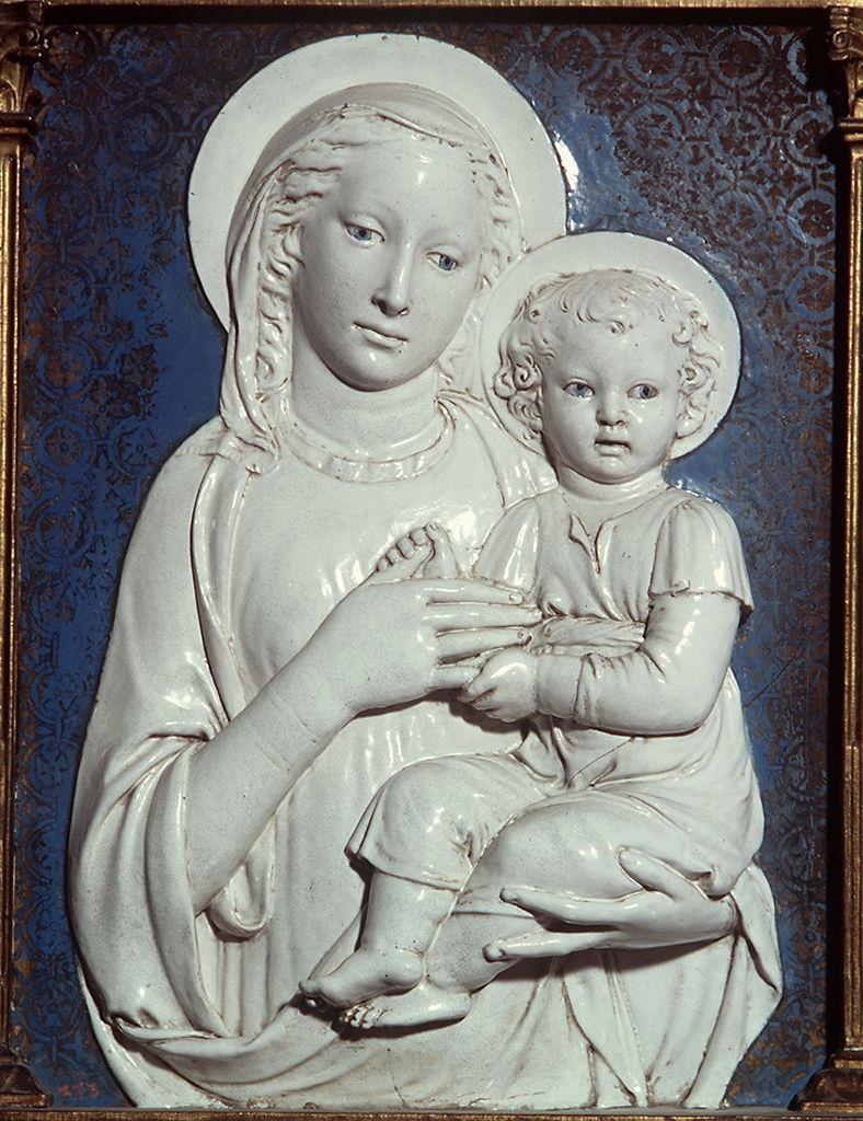 - NOTIZIE STORICO CRITICHE Il rilievo fu attribuito a Luca della Robbia da Bode che per primo lo pubblicò nel 1900. L'attribuzione a Luca è stata condivisa successivamente da tutta la critica, in primo luogo Marquand e Planiscig, con una datazione intorno al 1450-1460. Il Pope-Hennessy nel 1980 mette invece in dubbio questo riferimento, pur notando che il tipo della Vergine dipende dalla Madonna della Mela del Bargello e preferisce una attribuzione alla bottega o addirittura akl giovane Giovanni della Robbia verso la fine del secolo XV. Nei capelli del Bambino vede infatti una anticipazione dello stile del più giovane. Ad una attribuzione del rilievo a Luca della Robbia è favorevole Giancarlo Gentilini, che vede possibili confronti tra il Bambino e i riccioluti cherubini del tabernacolo di S. Egidio e una possibile datazione tra 1440 e 1442. L'opera giunse agli Uffizi nel 1900 dall'Ospedale di S. Maria Nuova e da qui nel 1903 pssò al Bargello. Non c'è certezza che laprovenienza originaria del rilievo sia lo stesso Ospedale
