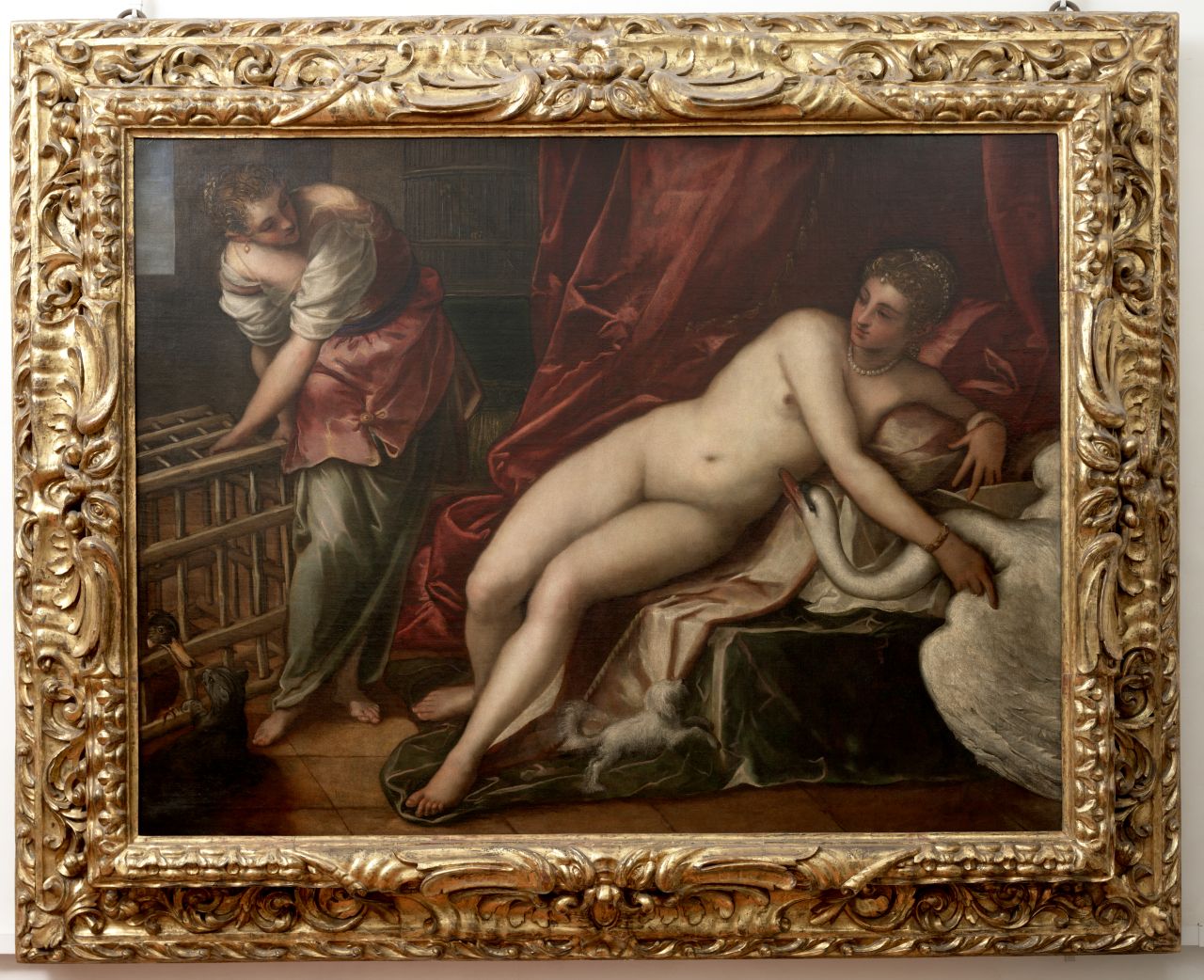 Personaggi: Leda. Figure: servente. Abbigliamento: all'antica. Interno. Architetture: finestra. Oggetti: gabbie; tendaggio; letto. Animali: anatra; gatto; cane. Metamorfosi: (Giove) cigno