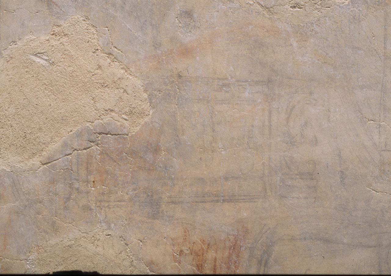 - NOTIZIE STORICO CRITICHE Fa parte del gruppo di disegni e iscrizioni murali che sono stati ritrovati e restaurati tra il 1975 e il 1977 nell'ambiente del lavamani adiacente la Sagrestia Nuova, nell'abside della Sagrestia e nel locale sottostante l'abside stessa. Per quanto riguarda l'ambiente del lavamani non é stata una vera e propria scoperta quanto piuttosto una valorizzazione di disegni che già si vedevano . I disegni invece del locale sottostante l'abside furono scoperti quando l'allora direttore del museo Paolo Dal Poggetto decise di ripulire e usare l'ambiente uscita per i visitatori. Per i disegni dell'abside si é trattato del risultato di una ricerca sistematica. I disegni sono stati attribuiti a Michelangelo e alla sua scuola dal Dal Poggetto che li ha catalogati in uno studio rigoroso cui ci siamo attenuti, riprendendone la sistematica suddivisione in 199 disegni. Lo studioso li ha distinti in due gruppi. Quelli del locale sottostante l'abside sono unitari e furono probabilmente eseguiti tra la metà di agosto e la prima decade di ottobre del 1530 da Michelangelo anno in cui l'artista, per sfuggire alla cattura da parte delle truppe imperiali che assediavano Firenze, si rifugiò con l'aiuto del Priore nel complesso laurenziano (Vasari, VII,p.201). I disegni dell'abside e dell' ambiente del lavamani sono più variati, registrando segni del maestro e degli allievi, di architettura e di figura, tracciati, sempre secondo il Dal Poggetto, tra il 1525 e il 1545 circa: rispettivamente nel '25-'26 quelli di architettura di mano di Michelangelo in quanto rispecchiano studi e progetti che in quegli anni erano già eseguiti o in fase di avanzata esecuzione; dopo il 1528 quelli di figura , sempre del Maestro, a partire dal 1528-30 fino al '45 quelli degli allievi. E' molto probabile infatti, sempre secondo il Dal Poggetto che almeno nell'abside la prima scialbatura sia stata data nel 1546. Vi é inoltre un gruppetto di disegni che il Dal Poggetto attribuisce al Tribolo datandoli a dopo il 1537 per la presenza tra questi disegni di uno studio di 'Capricorno', l'emblema di Cosimo I. Da notare infine un gruppo di scritte, numeri e segni che per il Dal Poggetto sono state tracciate oltre che da allievi, da operai, muratori, fornitori, visitatori etc. ugualmente prese in esame per un criterio di completezza. Per i disegni la maggior parte della critica ha confermato l'autografia michelangiolesca proposta dal Dal Poggetto; parere negativo é stato invece dato da Charles De Tolnay che assegna tutta la produzione ai garzoni di Michelangelo. Infine la Elam (1981) e il Middeldorf (comunicazione orale) attribuiscono i disegni di figura al Montorsoli, allievo di Michelangelo. Il presente disegno, secondo Dal Poggetto, si può considerare una delle prime idee michelangiolesche per il portale poi realizzato nel Vestibolo della BibliotecaLaurenziana