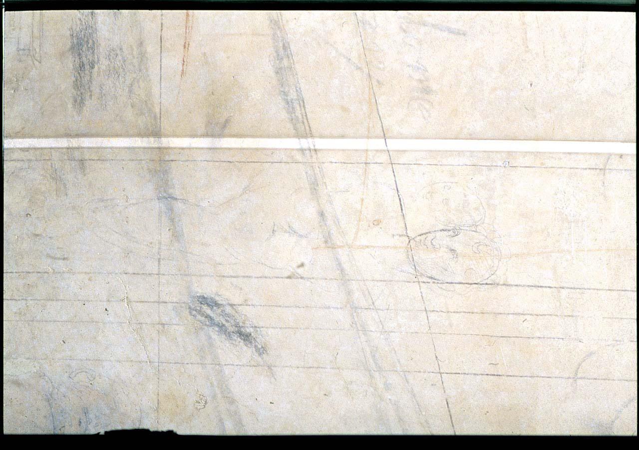 - NOTIZIE STORICO CRITICHE Fa parte del gruppo di disegni e iscrizioni murali che sono stati ritrovati e restaurati tra il 1975 e il 1977 nell'ambiente del lavamani adiacente la Sagrestia Nuova, nell'abside della Sagrestia e nel locale sottostante l'abside stessa. Per quanto riguarda l'ambiente del lavamani non é stata una vera e propria scoperta quanto piuttosto una valorizzazione di disegni che già si vedevano . I disegni invece del locale sottostante l'abside furono scoperti quando l'allora direttore del museo Paolo Dal Poggetto decise di ripulire e usare l'ambiente uscita per i visitatori. Per i disegni dell'abside si é trattato del risultato di una ricerca sistematica. I disegni sono stati attribuiti a Michelangelo e alla sua scuola dal Dal Poggetto che li ha catalogati in uno studio rigoroso cui ci siamo attenuti, riprendendone la sistematica suddivisione in 199 disegni. Lo studioso li ha distinti in due gruppi. Quelli del locale sottostante l'abside sono unitari e furono probabilmente eseguiti tra la metà di agosto e la prima decade di ottobre del 1530 da Michelangelo anno in cui l'artista, per sfuggire alla cattura da parte delle truppe imperiali che assediavano Firenze, si rifugiò con l'aiuto del Priore nel complesso laurenziano (Vasari, VII,p.201). I disegni dell'abside e dell' ambiente del lavamani sono più variati, registrando segni del maestro e degli allievi, di architettura e di figura, tracciati, sempre secondo il Dal Poggetto, tra il 1525 e il 1545 circa: rispettivamente nel '25-'26 quelli di architettura di mano di Michelangelo in quanto rispecchiano studi e progetti che in quegli anni erano già eseguiti o in fase di avanzata esecuzione; dopo il 1528 quelli di figura , sempre del Maestro, a partire dal 1528-30 fino al '45 quelli degli allievi. E' molto probabile infatti, sempre secondo il Dal Poggetto che almeno nell'abside la prima scialbatura sia stata data nel 1546. Vi é inoltre un gruppetto di disegni che il Dal Poggetto attribuisce al Tribolo datandoli a dopo il 1537 per la presenza tra questi disegni di uno studio di 'Capricorno', l'emblema di Cosimo I. Da notare infine un gruppo di scritte, numeri e segni che per il Dal Poggetto sono state tracciate oltre che da allievi, da operai, muratori, fornitori, visitatori etc. ugualmente prese in esame per un criterio di completezza. Per i disegni la maggior parte della critica ha confermato l'autografia michelangiolesca proposta dal Dal Poggetto; parere negativo é stato invece dato da Charles De Tolnay che assegna tutta la produzione ai garzoni di Michelangelo. Infine la Elam (1981) e il Middeldorf (comunicazione orale) attribuiscono i disegni di figura al Montorsoli, allievo di Michelangelo. Il presente disegno, secondo Dal Poggetto, è da avvicinare ai disegni n.34 F e n.15F di Casa Buonarroti attribuiti ad Antonio Mini. Il Dal Poggetto data il disegno anteriormente al 1531, data della partenza del Mini da Firenze