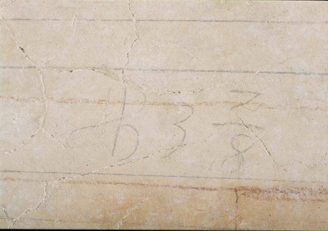 - NOTIZIE STORICO CRITICHE Fa parte del gruppo di disegni e iscrizioni murali che sono stati ritrovati e restaurati tra il 1975 e il 1977 nell'ambiente del lavamani adiacente la Sagrestia Nuova, nell'abside della Sagrestia e nel locale sottostante l'abside stessa. Per quanto riguarda l'ambiente del lavamani non é stata una vera e propria scoperta quanto piuttosto una valorizzazione di disegni che già si vedevano . I disegni invece del locale sottostante l'abside furono scoperti quando l'allora direttore del museo Paolo Dal Poggetto decise di ripulire e usare l'ambiente uscita per i visitatori. Per i disegni dell'abside si é trattato del risultato di una ricerca sistematica. I disegni sono stati attribuiti a Michelangelo e alla sua scuola dal Dal Poggetto che li ha catalogati in uno studio rigoroso cui ci siamo attenuti, riprendendone la sistematica suddivisione in 199 disegni. Lo studioso li ha distinti in due gruppi. Quelli del locale sottostante l'abside sono unitari e furono probabilmente eseguiti tra la metà di agosto e la prima decade di ottobre del 1530 da Michelangelo anno in cui l'artista, per sfuggire alla cattura da parte delle truppe imperiali che assediavano Firenze, si rifugiò con l'aiuto del Priore nel complesso laurenziano (Vasari, VII,p.201). I disegni dell'abside e dell' ambiente del lavamani sono più variati, registrando segni del maestro e degli allievi, di architettura e di figura, tracciati, sempre secondo il Dal Poggetto, tra il 1525 e il 1545 circa: rispettivamente nel '25-'26 quelli di architettura di mano di Michelangelo in quanto rispecchiano studi e progetti che in quegli anni erano già eseguiti o in fase di avanzata esecuzione; dopo il 1528 quelli di figura , sempre del Maestro, a partire dal 1528-30 fino al '45 quelli degli allievi. E' molto probabile infatti, sempre secondo il Dal Poggetto che almeno nell'abside la prima scialbatura sia stata data nel 1546. Vi é inoltre un gruppetto di disegni che il Dal Poggetto attribuisce al Tribolo datandoli a dopo il 1537 per la presenza tra questi disegni di uno studio di 'Capricorno', l'emblema di Cosimo I. Da notare infine un gruppo di scritte, numeri e segni che per il Dal Poggetto sono state tracciate oltre che da allievi, da operai, muratori, fornitori, visitatori etc. ugualmente prese in esame per un criterio di completezza. Per i disegni la maggior parte della critica ha confermato l'autografia michelangiolesca proposta dal Dal Poggetto; parere negativo é stato invece dato da Charles De Tolnay che assegna tutta la produzione ai garzoni di Michelangelo. Infine la Elam (1981) e il Middeldorf (comunicazione orale) attribuiscono i disegni di figura al Montorsoli, allievo di Michelangelo. La presente scritta b 3/6 corrisponde a tre braccia e sette ottavi, cioè cm.58,O4