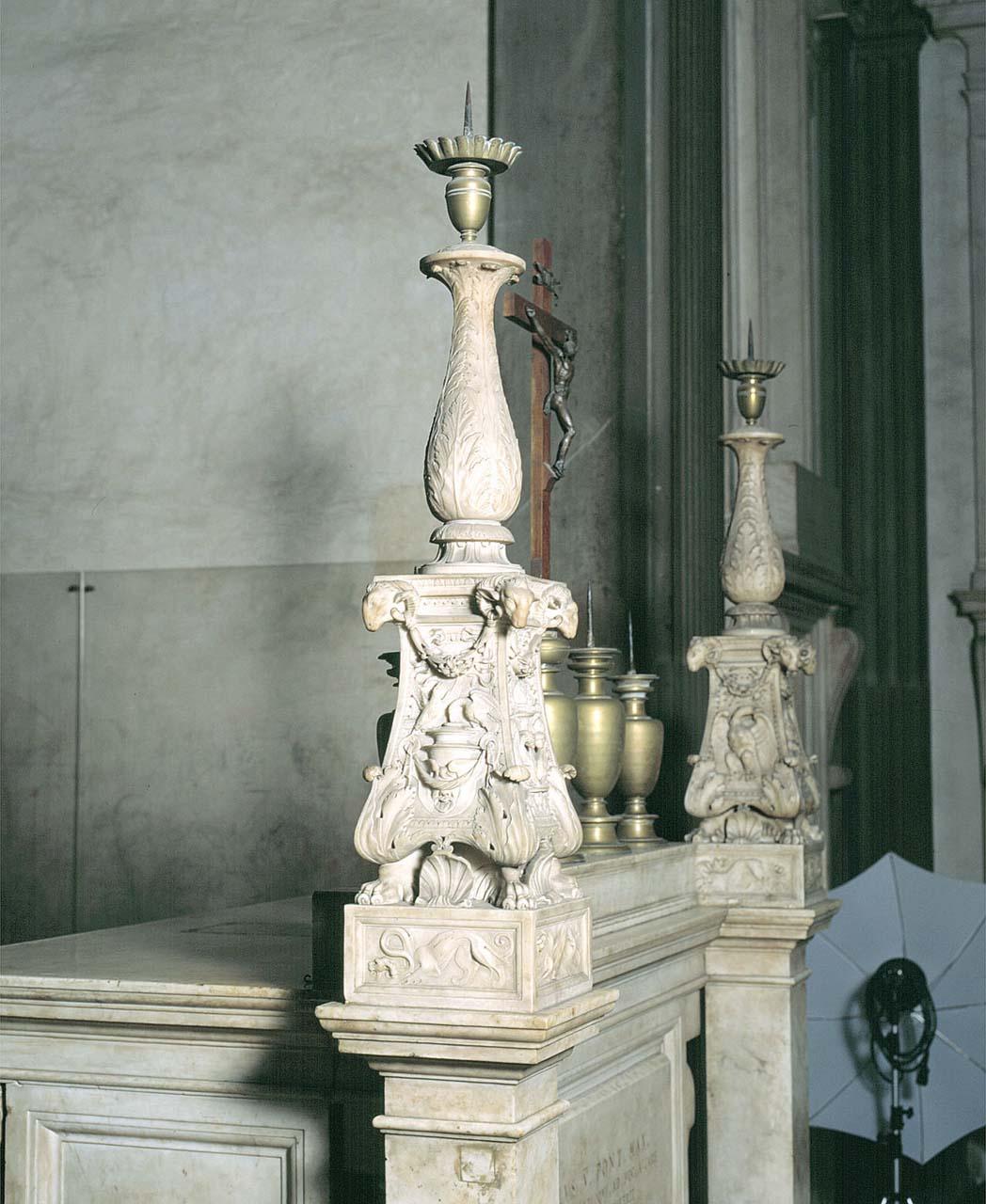 - NOTIZIE STORICO CRITICHE Al nome di Cosini sono stati accostati i due candelieri marmorei dell’altare maggiore della Sagrestia Nuova eseguiti su disegno del Buonarroti (Carrara, Ferretti 2016, p. 67). Nella letteratura artistica ricorre la notizia dell’accidentale rottura di uno dei due manufatti e del conseguente rifacimento ad opera di Girolamo Ticciati nel 1741. L’origine dell’informazione non viene quasi mai ricordata anche se, da un accenno del de Tolnay, sembra che la notizia possa aver avuto origine da quanto scriveva Anton Francesco Gori nella sua edizione della “Vita di Michelangelo di Buonarroti” di Ascanio Condivi uscita nel 1746, quindi a breve distanza dall’avvenimento, nella quale, oltre a riferire i candelieri allo stesso Michelangelo, ricordava che uno rotto fu fatto restaurare intorno al 1741 dall’Elettrice Palatina. Qualche anno dopo però il Bottari riferisce l’intervento del Ticciati al completamento di parti del manufatto rimaste in fase di abbozzo escludendo categoricamente la rottura accidentale. Tale informazione il Bottari la ribadisce anche in una lettera che scrive allo stesso Gori nel 1747. Il canonico Moreni, nella sua pubblicazione data alle stampe nel 1813, precisa che il candeliere in cornu Epistolae, a destra di chi guarda l’altare, rotto casualmente, fu rifatto dal Ticciati intorno al 1741 per ordine dell’Elettrice Palatina Anna Maria Luisa de’ Medici (cfr. Campigli 2006, pp. 102-103, note 105-106, 108). Campigli (2006, pp. 103-104, nota 111), sulla scorta di materiale di archivio, puntualizza che il Ticciati fu effettivamente pagato il 12 novembre 1742 per terminare uno dei due candelieri e per pulire l’altro, e che nessuna rottura o rifacimento sono documentati. Purtroppo le fonti non chiariscono quale dei due manufatti sia stato completato dal Ticciati e l’omogeneità di stile rende arduo il riconoscimento; tuttavia, il Campigli nota proprio sul candeliere di destra un fare più preciso, quasi lezioso. Ad una più attenta osservazione lo studioso riconosce l’intervento di due artisti diversi: lo si vede nel frequente uso del sottosquadro che lascia emergere l’intaglio delle parti a rilievo di quello di destra, ravvisabile nelle foglie d’acanto agli angoli delle basi, e che manca completamente nell’altro; lo si vede nei draghi del basamento caratterizzati in quello di sinistra dalla maggiore incisività data ai rilievi e alle forme, mentre dall’altra parte è tutto più morbido, sia nello stacco dal fondo che nel dosaggio della profondità del rilievo. In virtù di tali confronti il Campigli ipotizza per il candeliere di sinistra la responsabilità di Cosini, che potrebbe aver iniziato i lavori nel 1526 circa per poi interromperli l’anno successivo, a causa della caduta dei Medici e l’instaurazione della Repubblica fiorentina. Con la ripresa del cantiere di San Lorenzo alla fine del 1530, quando Cosini era occupato a Genova, è plausibile che il candeliere di destra sia stato affidato ad un altro scultore. Campigli accoglie con cautela la proposta di Wallace che riconosce nell’anonimo artefice Simone Mosca. L’intervento settecentesco, oltre a completare le parti mancanti, avrà uniformato l’aspetto dei due candelieri togliendo certe ruvidezze grazie all’utilizzo documentato della pietra pomice. Sulla base di tali considerazioni sembra quindi plausibile riferire al candeliere di sinistra, attribuito a Cosini e rimasto incompiuto, l'intervento di completamento operato dal Ticciati nel 1742. Secondo Thode il candelabro fu eseguito presumibilmente da Silvio Cosini su disegno di Michelangelo. Esiste un disegno agli Uffizi, probabilmente di G. A. Dosio, in cui è accennata una decorazione con mascherone (in Tolnay, 1948, fig. 208). Il Dal Poggetto ipotizza che si riferisca al candelabro destro un disegno murale che secondo lui è di Michelangelo, posto nel lavamani della Sagrestia Nuova (Dal Poggetto, 1976, n. 18) e risalente a prima del 1534. Lo stesso studioso tuttavia rivede questa ipotesi nel 1979