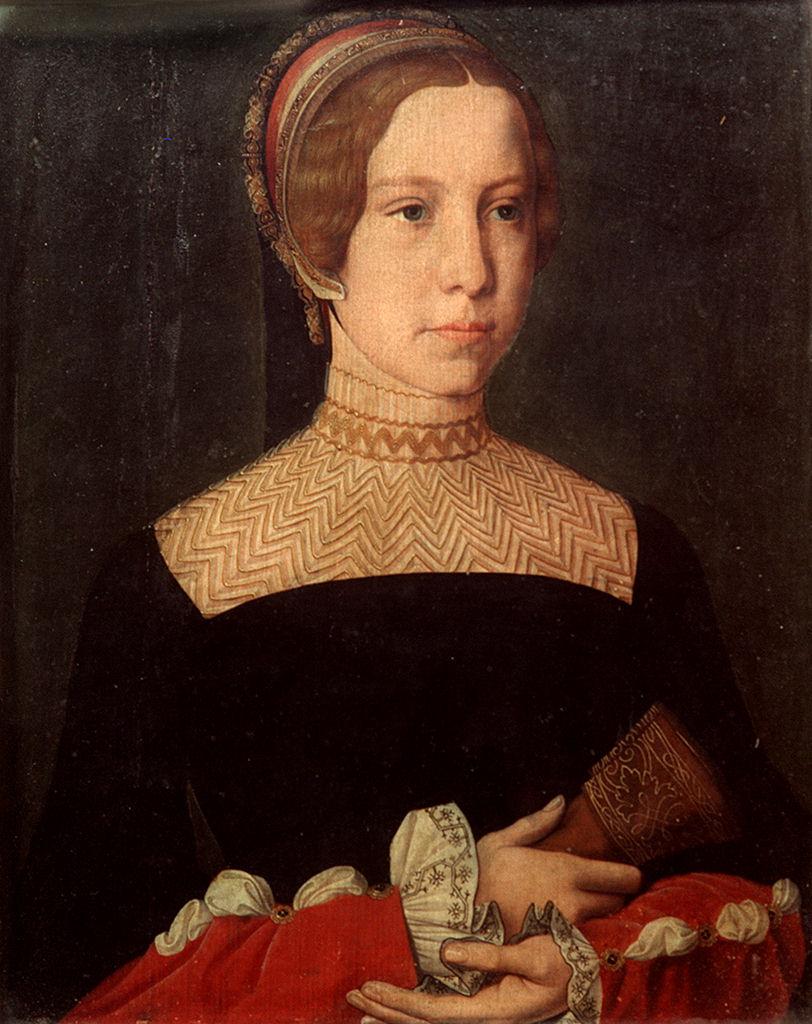 Ritratti: Madeleine de la Tour d'Auvergne (?). Abbigliamento: veste; camicia ricamata con sboffi; corpetto decorato; cuffia ricamata