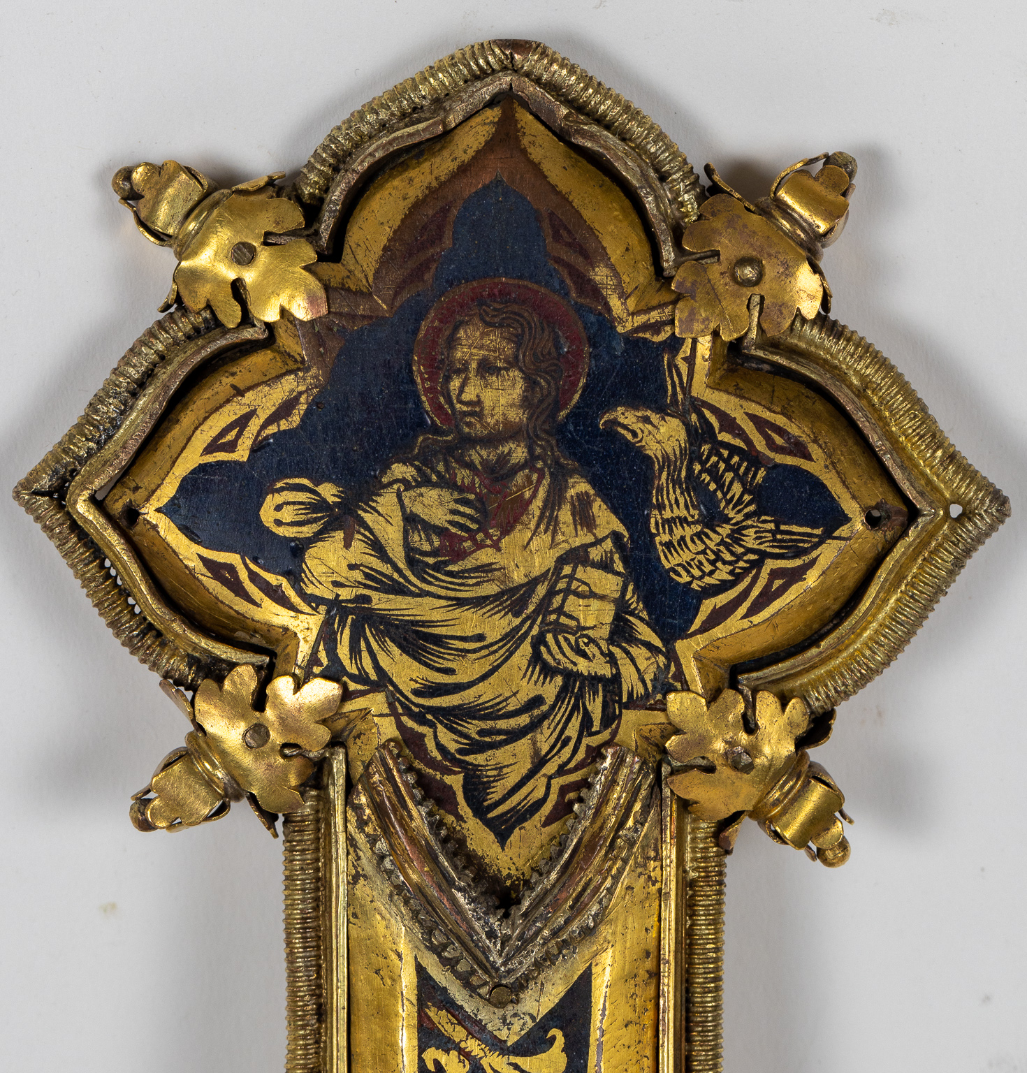 Terminazione quadriloba del verso di croce processionale con all'interno la rappresentazione di San Giovanni Evangelista