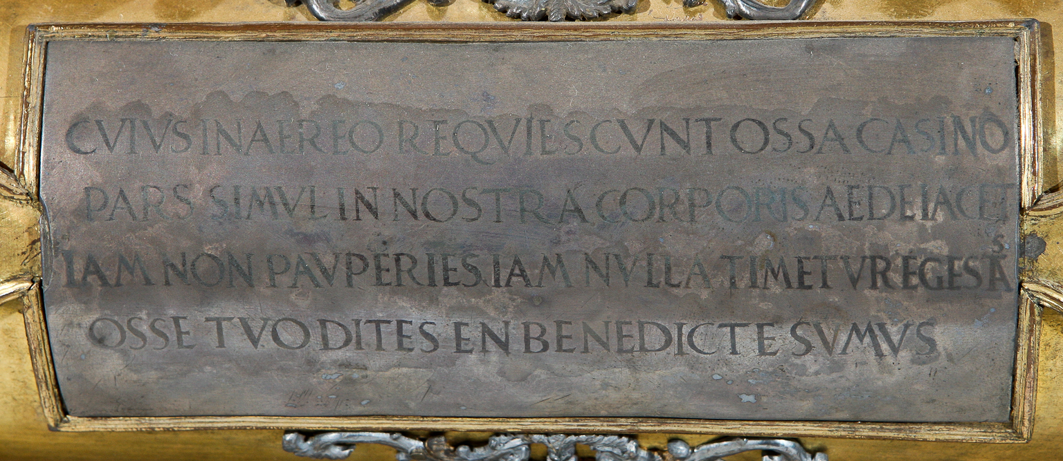 - ISCRIZIONI al verso, piastra urna - CUIUS IN AEREO REQUIESCUNT OSSA CASINO/PARSSIMUL IN NOSTRA CORPORIS AEDE IACET/IAM NONPAUPERIES IAM NULLA TIMETUR EGESTAS/OSSE TUODITES EN BENEDICTE SUMUS - capitale -