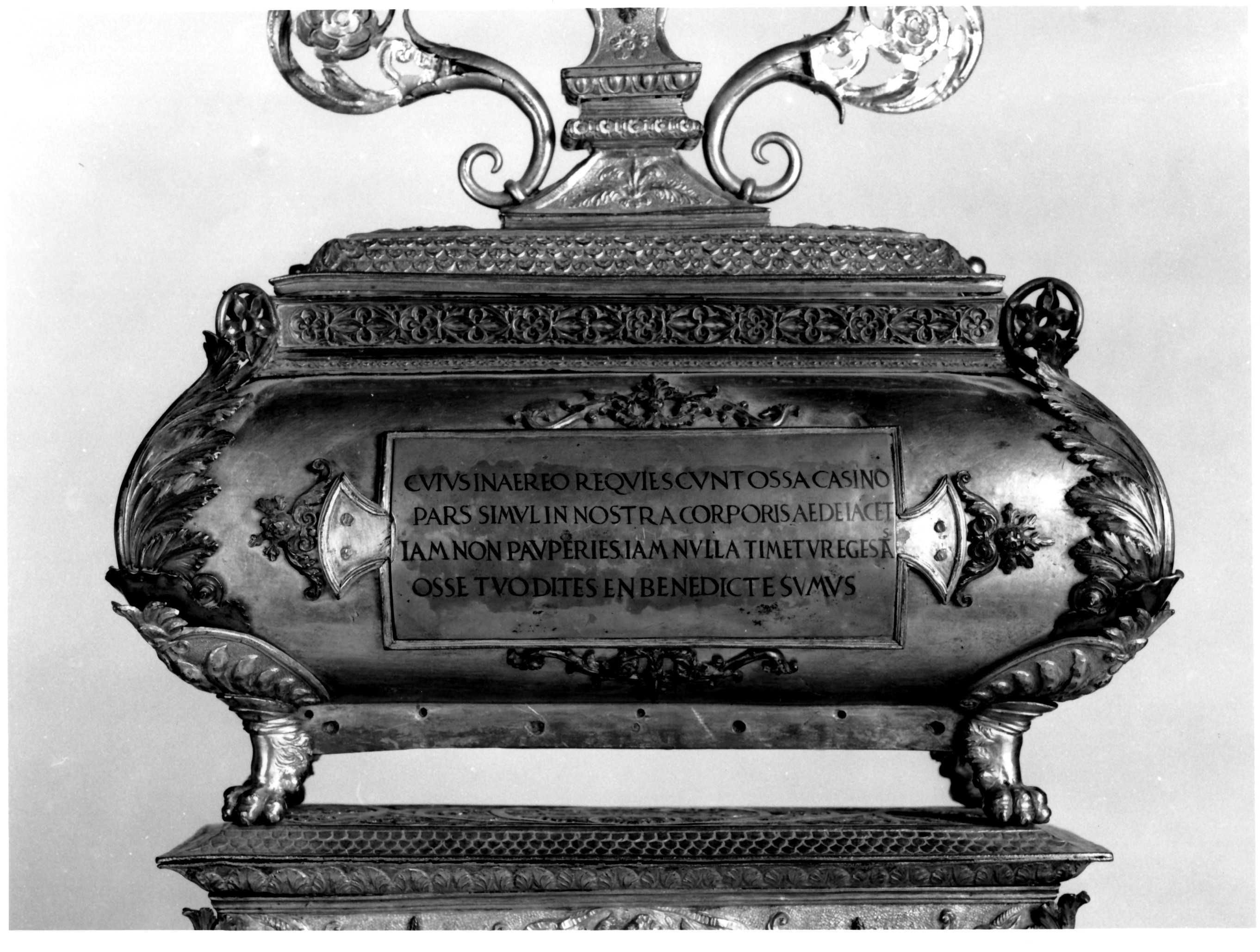Urna di reliquiario con piedi a zampa di leone, finestrella a luci ovoidali, nel verso placca con iscrizione. Sul lato destro placchetta con San Benedetto e sul lato sinistro San Placido. Decorazione a volute, rosette e foglie d'acanto