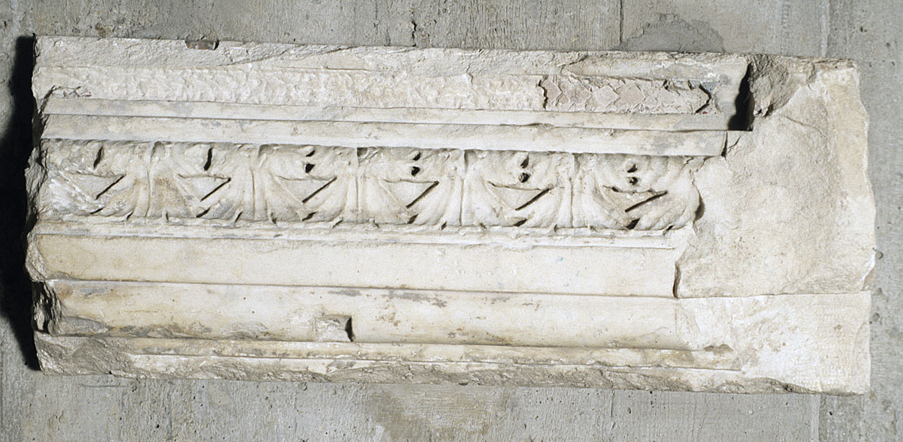 Probabile frammento di cornice o di stipite. Decorazioni: fregio a foglie