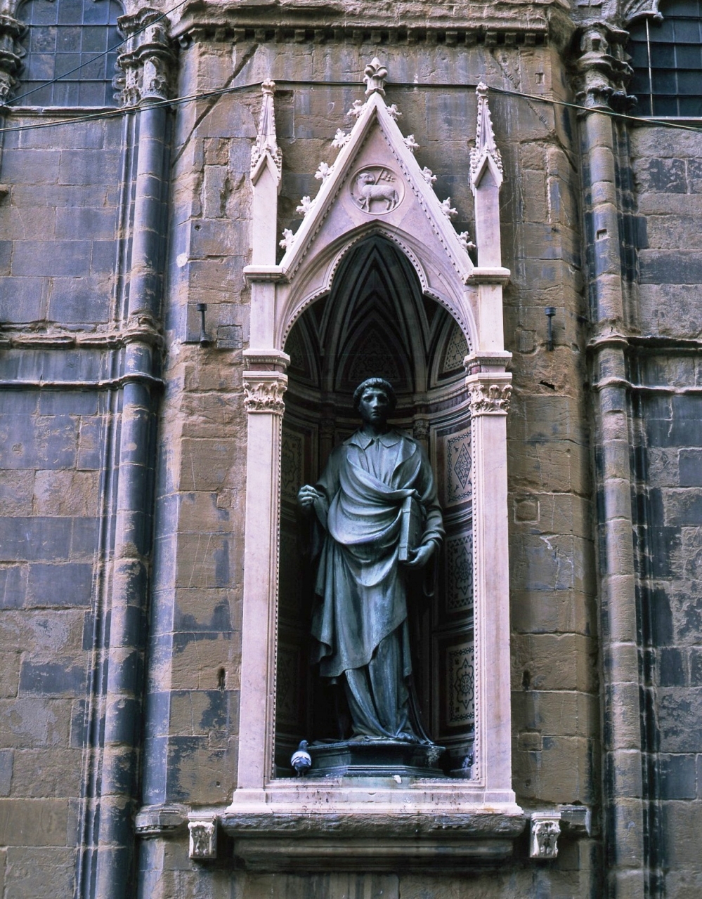 - NOTIZIE STORICO CRITICHE Nelle sue linee è molto simile al coevo tabernacolo dell'Arte della Seta e, insieme a quello, è citato da un documento del 1340 pubblicato dal Franceschini come modello da seguire per la costruzione da seguire per il tabernacolo dell'Arte di Calimala. Che questo tabernacolo sia il prototipo degli altri, è evidente secondo la Mannini in una certa arcaicità d'intaglio. Inoltre i motivi geometrici del marmo intarsiato nella nicchia sono influenzati da quelli arnolfiani del campanile del Duomo